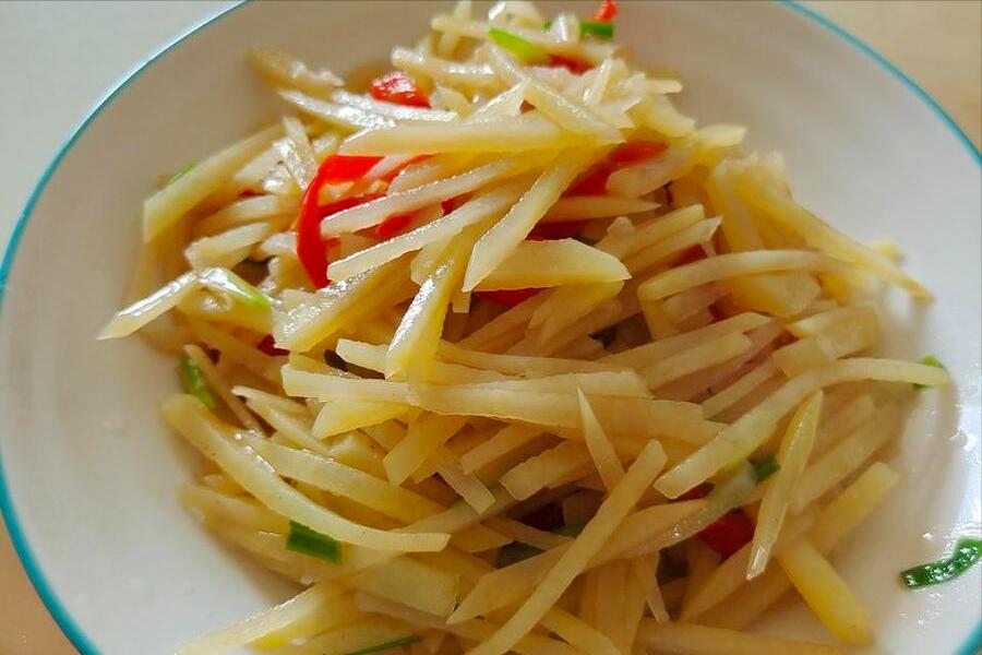 土豆切絲,清水淘洗2遍,直至將澱粉洗掉,幹辣椒、青辣椒、大蒜全部切好。鍋中倒油,燒熱下入幹辣椒、大蒜,炒香後倒入土豆絲,接着烹入少許醋,繼續翻炒一陣子,直至土豆絲變軟,這時候來點鹽、雞精,再把青辣椒倒進去,炒勻即可出鍋。