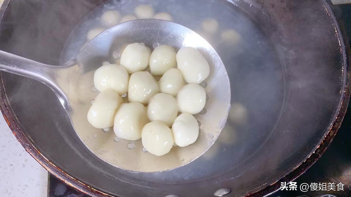 然後,我們開始煮丸子。在煮鍋中加入適量的清水並大火燒開,將團好的芋頭丸子全部放入鍋中。煮約10秒後,用鏟子輕輕滑動鍋底以防粘鍋,並轉爲中火繼續煮。當芋頭丸子變得透明發亮時,就說明已經煮熟了。此時可以將它們撈出並放入冷水中過涼,這樣會使丸子更加爽滑有彈性。
