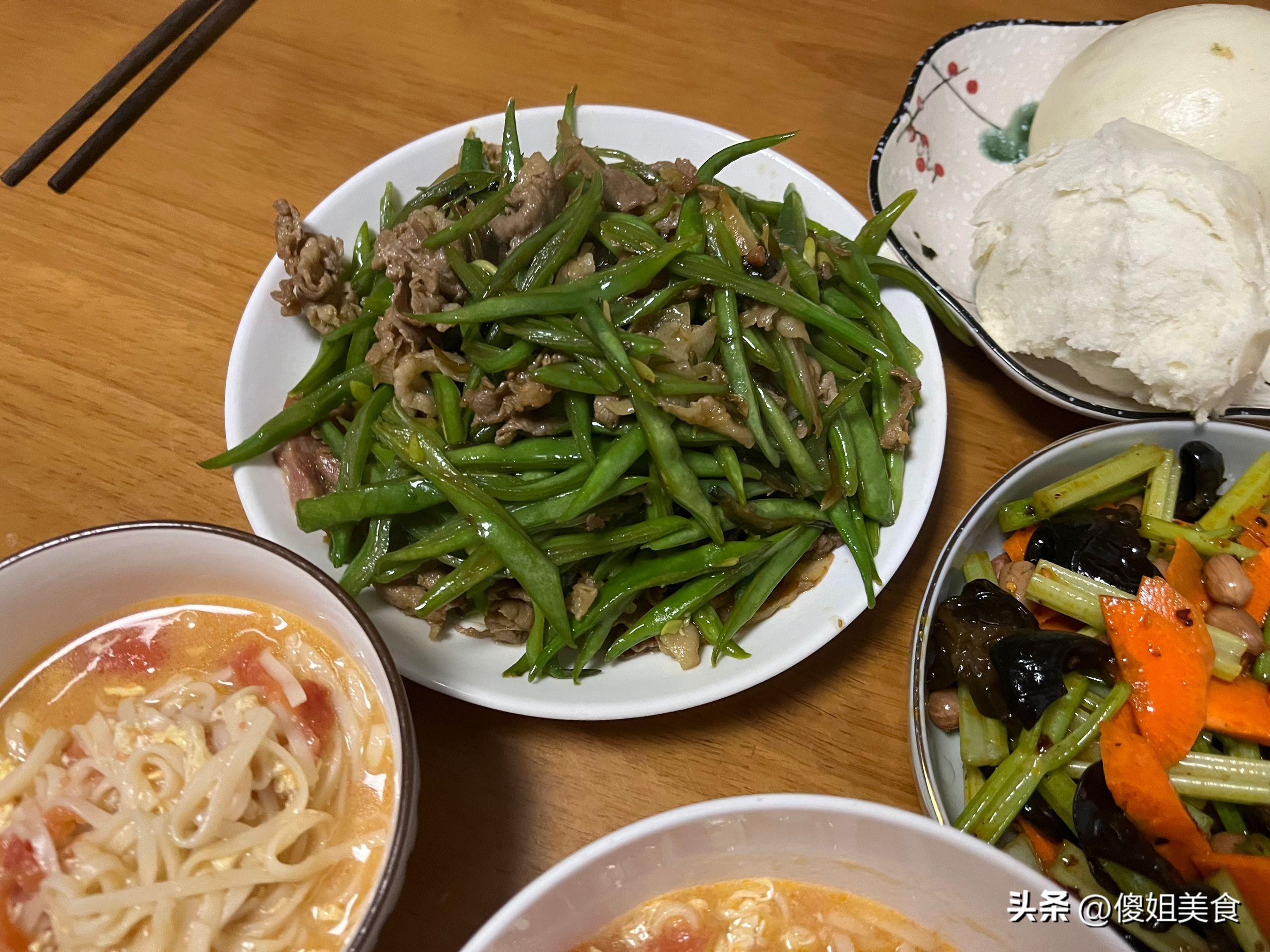 孩子每頓飯都要有個肉菜,回來的路上買了點豬瘦肉,順便買了點芸豆,芸豆炒肉很好喫。豬肉買回來後沖洗一下攥幹水分,改刀切成細長條,然後芸豆也切成細長條,炒之前用開水煮一下,去除豆腥味,炒的時候也好熟。然後先煸炒一下肉絲,倒入適量的味極鮮把豬肉煸炒上色,隨後把芸豆放入鍋中大火不停的翻炒,把芸豆炒至入味,關火盛入盆內。這份鮮美入味的芸豆炒肉兒子可沒少喫,光挑裏面的肉喫了。