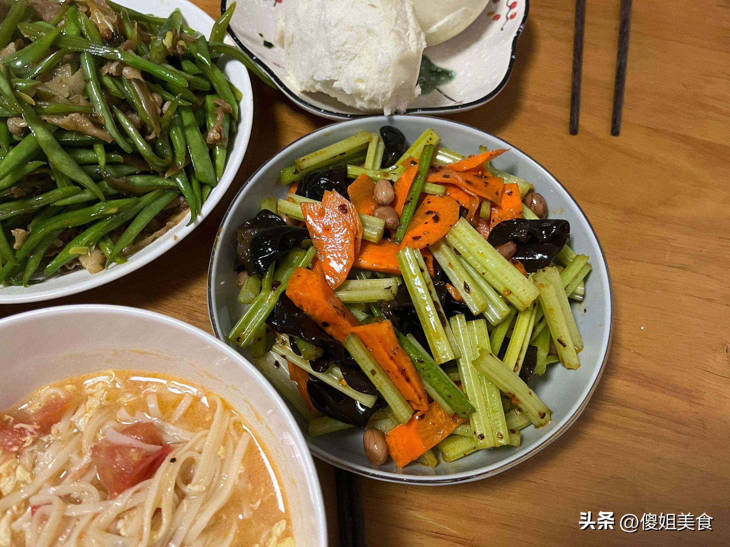 這個季節最下飯的還是涼拌菜,上次偷懶自己沒有拌涼菜,就在門口的超市讓人家給拌了點涼菜,那口感別提有多難喫了,太甜了,一口沒喫全給扔掉了。心想這次還是自己拌涼菜吧,早起走的時候就把木耳給泡上了,泡大的木耳擇淨根蒂,抓洗乾淨裏面的泥沙,然後將木耳焯水煮熟,又切了些芹菜段、胡蘿蔔片和水煮花生放在裏面,直接放上少許陳醋、適量味極鮮、辣椒油、鹽和香油拌均勻就可以喫了。煮一芹菜不需要焯水,焯水後的芹菜會發黃,口感也爽脆,直接拌着喫就可以,這樣簡單一拌比外面拌的涼菜好喫多了。