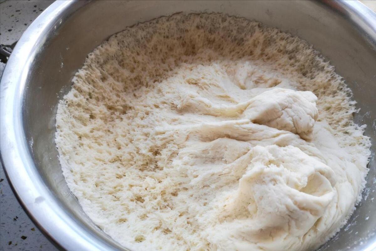 5、這個過程就可以去做其他事情了,耐心等待麪糰的醒發,半個多小時後去看看,正常發酵好的麪糰,應該是什麼樣子的呢?應該是非常大、非常軟的,並且可以看一下內裏,已經成了蜂窩狀了,很多小氣孔。
