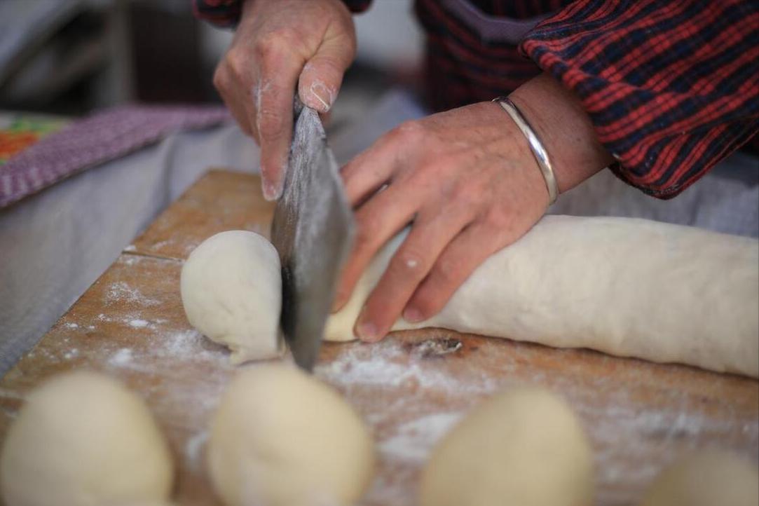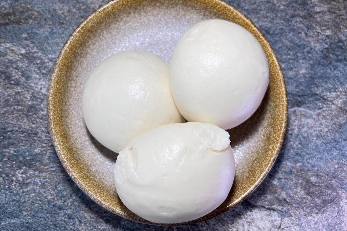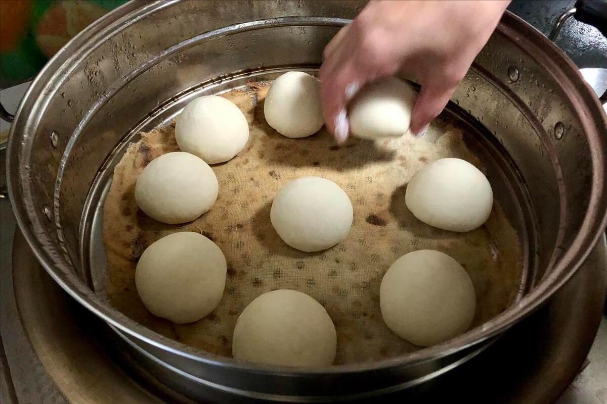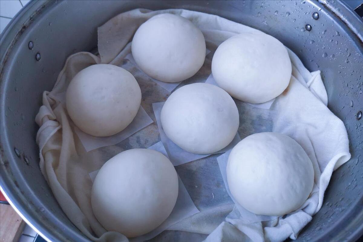 6、這樣就可以將麪糰拿出來了,開始揉搓排氣,排氣之後繼續揉搓,揉搓成一長條,再切成劑子,整理一下就是饅頭的形狀了。鍋子裏倒水,將饅頭放在裏面,還需二次發酵20分鐘,才能讓饅頭變得更蓬鬆、更暄軟,這是第3個要點。