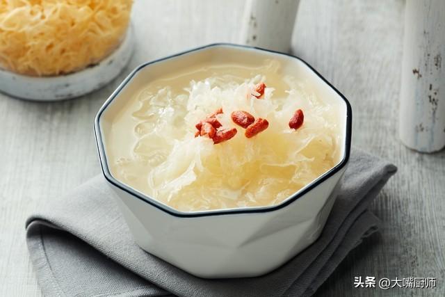 待銀耳燉至軟糯、湯汁濃稠時,加入適量的冰糖調味即可。這道羹品口感滑嫩,甜度適中,紅棗和枸杞的香甜與銀耳的滑爽完美融合,是夏日裏一道極佳的潤燥甜品。