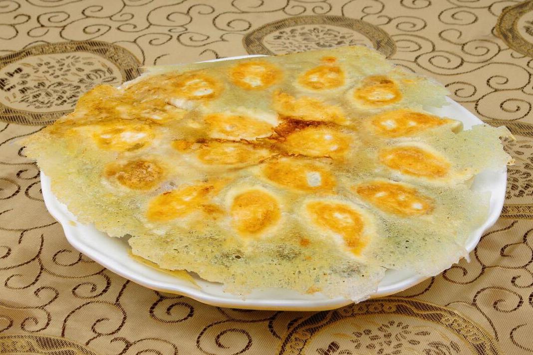 4、煎到底部定型之後,我們就可以把剛纔調製好的麪粉澱粉水倒進去了,均勻的淋入其中,然後再將鍋蓋蓋上,燜上一段時間,直至燜到裏面出現水開的聲音後,就差不多可以了。