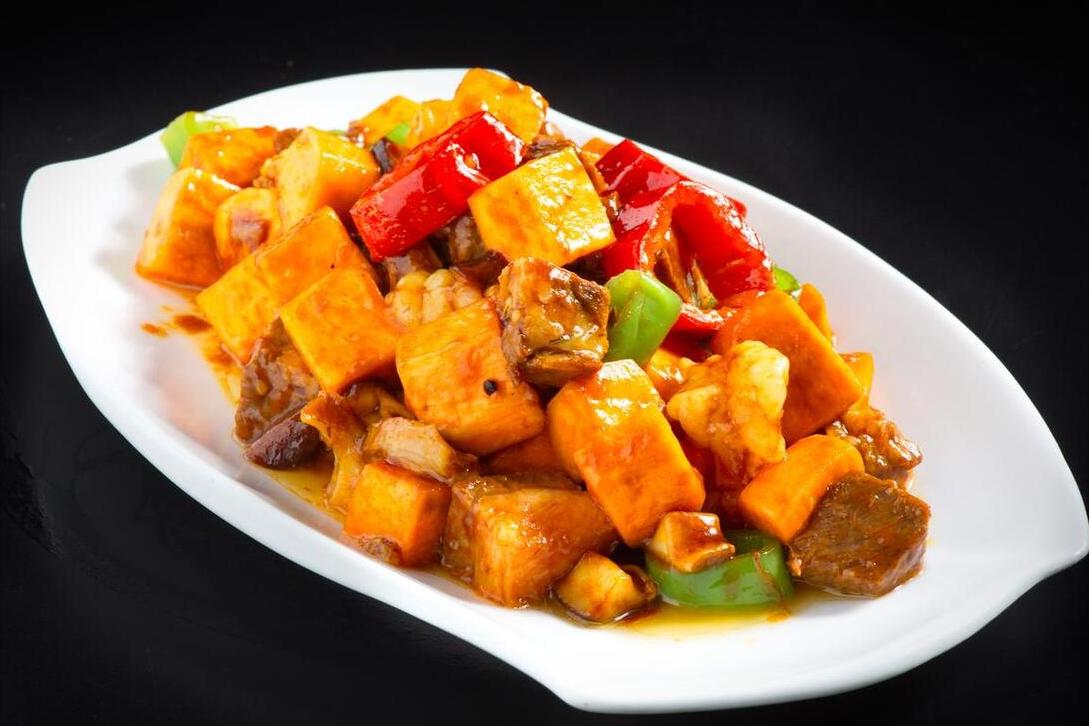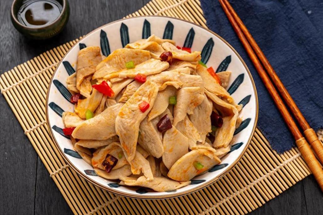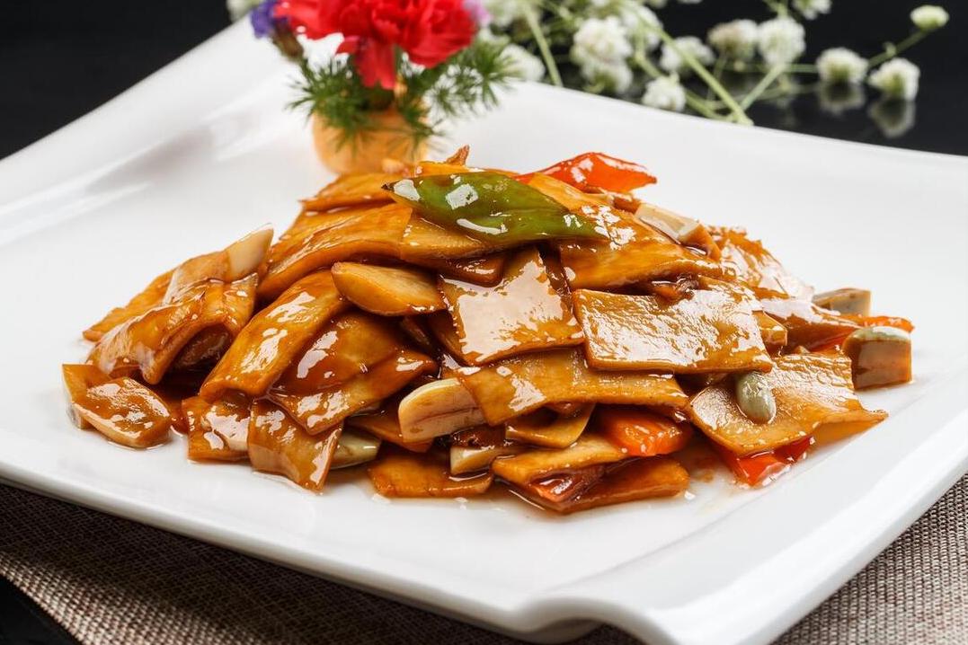 食材:杏鮑菇、大蔥、花生米、幹辣椒、生薑、花椒、鹽、雞精、白糖、醋、醬油、香油、澱粉、食用油