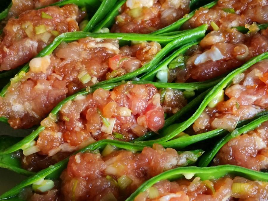 4.肉餡醃製入味後,取出焯燙過的扁豆,從一邊打開,將肉餡填到扁豆裏,裏面的豆子不需要取出,和肉餡混到一起即可,這樣蒸好後,肉的鮮香味夾雜着豆香味,喫起來特美味。