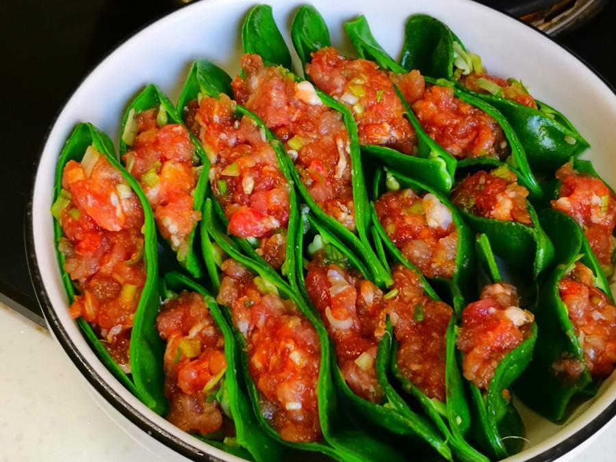 5.依次將每個扁豆中都夾入肉餡後,再將它們擺放到盤子裏,然後放到蒸鍋中,大火將鍋中的水燒開後,再繼續蒸15分鐘左右。