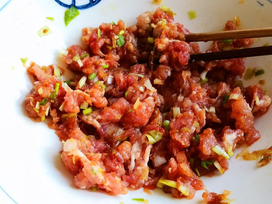 3.再取一塊豬肘肉切碎剁細後,加入適量的蔥花和薑末,攪拌均勻後再加入2勺生抽、一勺蠔油和適量的花椒粉、胡椒粉,攪拌均勻後醃製20分鐘入味。