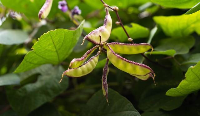 扁豆因其長的酷似豬的耳朵,因此還有個名字叫“豬耳朵扁豆”,它一般在每年的6月份左右上市。因爲我特別喜歡喫這個豬耳朵扁豆,所以老媽每年都會給種上幾株,每年到了這個時候便會有喫不完的扁豆,一串一串肥大的扁豆配着紫色的小花掛滿架子,看起來甚是可愛!