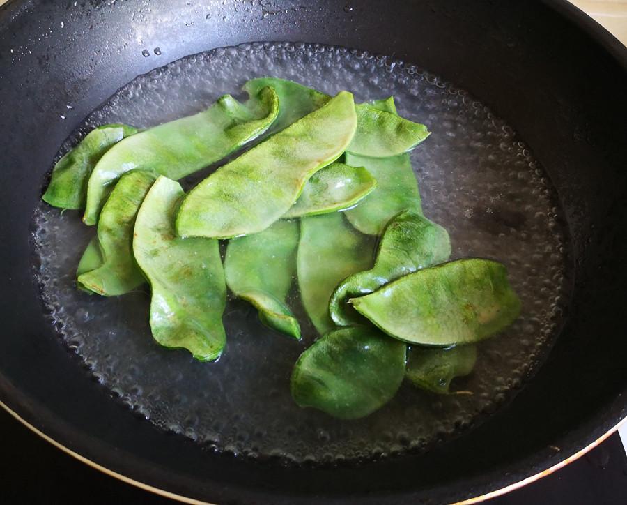 2.提前燒一鍋開水,把扁豆下水焯燙一下,一是爲了去除異味,二是焯燙可以使扁豆變軟,以防止下一步操作時掰碎。
