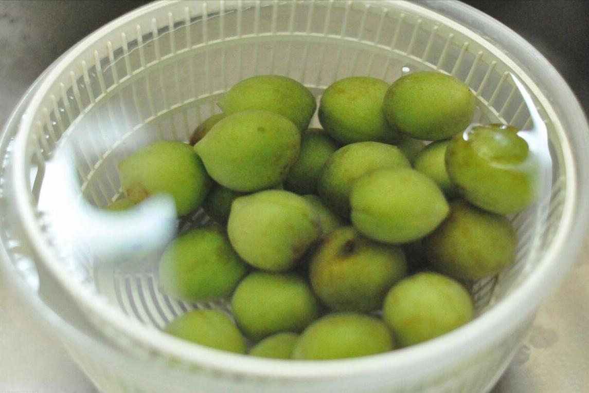 1、青梅倒在水中,加上適量的鹽攪拌均勻後,浸泡10分鐘,然後再一個個的搓洗乾淨,放在太陽下將水分晾乾。