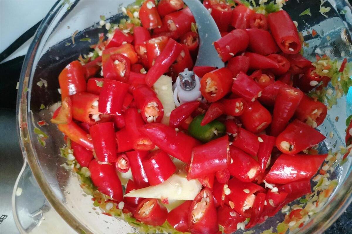 食材:紅辣椒500g、青椒300g、大蒜1頭、生薑1塊、食鹽2小勺、白醋1小勺、高度白酒1小勺
