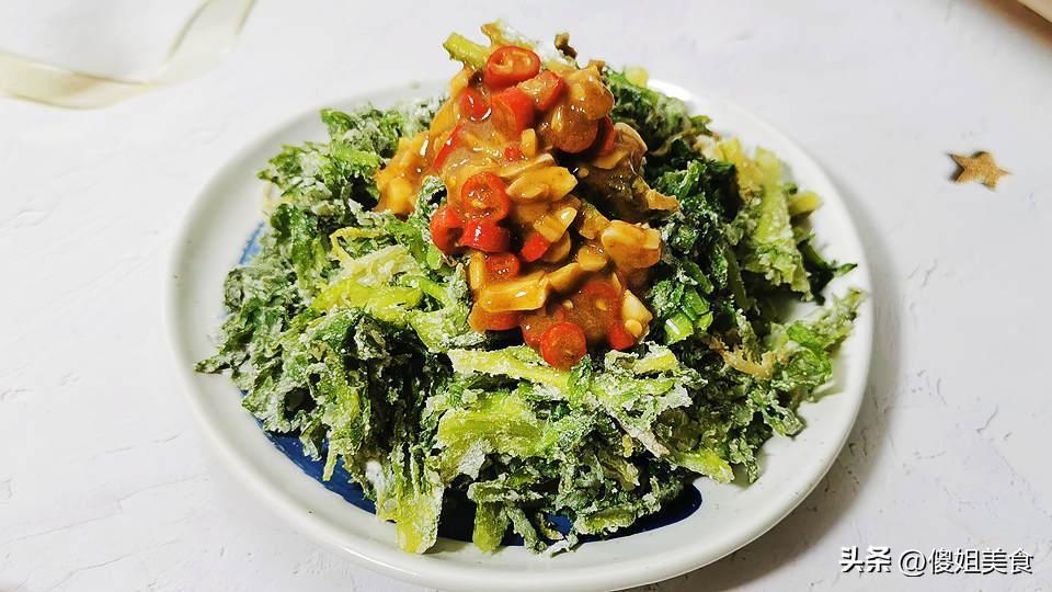 5、苦菊蒸熟後,取出稍微放涼,然後澆上調好的料汁,輕輕拌勻即可食用。這樣做出來的清蒸苦菊,既保留了苦菊的清脆口感,又融入了料汁的香辣味道,非常適合夏天食用。
