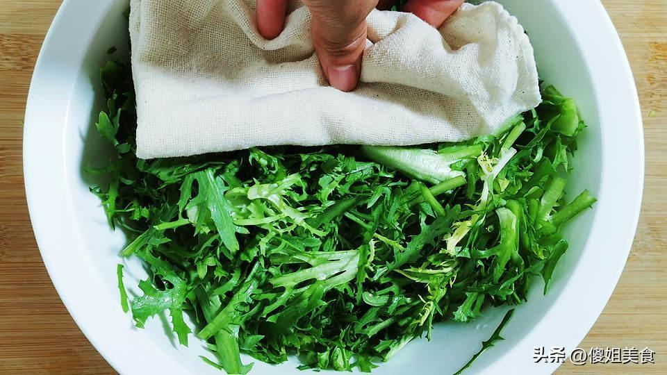 1、將苦菊清洗乾淨,注意要仔細去掉根部的泥沙。順便分享個清洗小竅門,因爲它的葉子很鮮嫩,不能搓洗,可以將苦菊放入淡鹽水中浸泡幾分鐘,然後用流動的水沖洗乾淨,這樣喫起來就放心了。