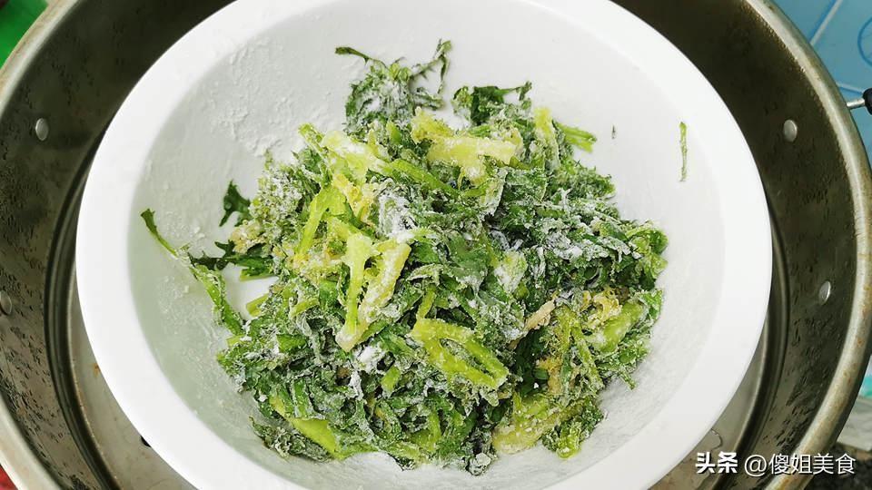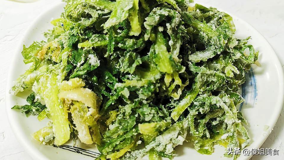 2、瀝乾水分後,對半切開放入大碗中,少量多次地加入麪粉,輕輕攪拌,讓每片苦菊的葉子均勻裹上一層薄薄的麪粉,注意麪粉的量,一定要少量多次地加入,避免加的太多,從而導致這盤菜比較粘,那就影響口感了。