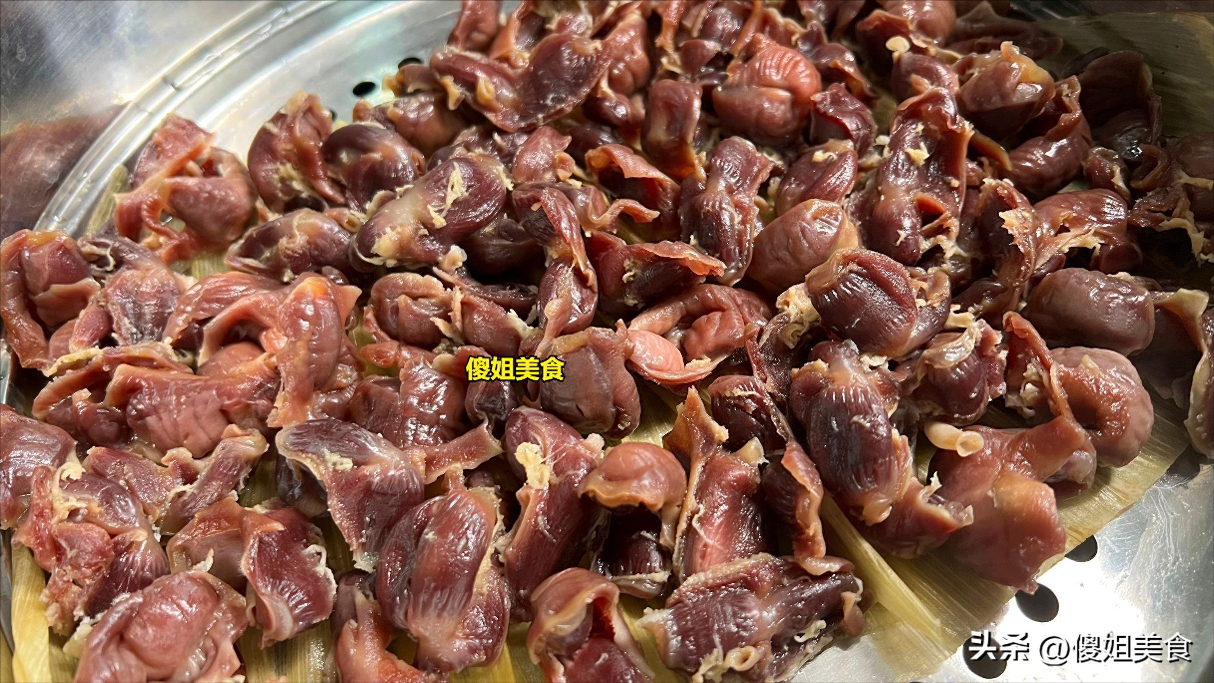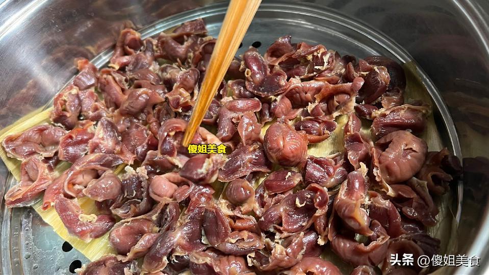 蒸煮入味:將焯水後的雞胗放入蒸鍋中,大火蒸40分鐘左右,直到雞胗熟透且入味。蒸煮的過程中,雞胗會吸收調料的香味,變得更加美味。