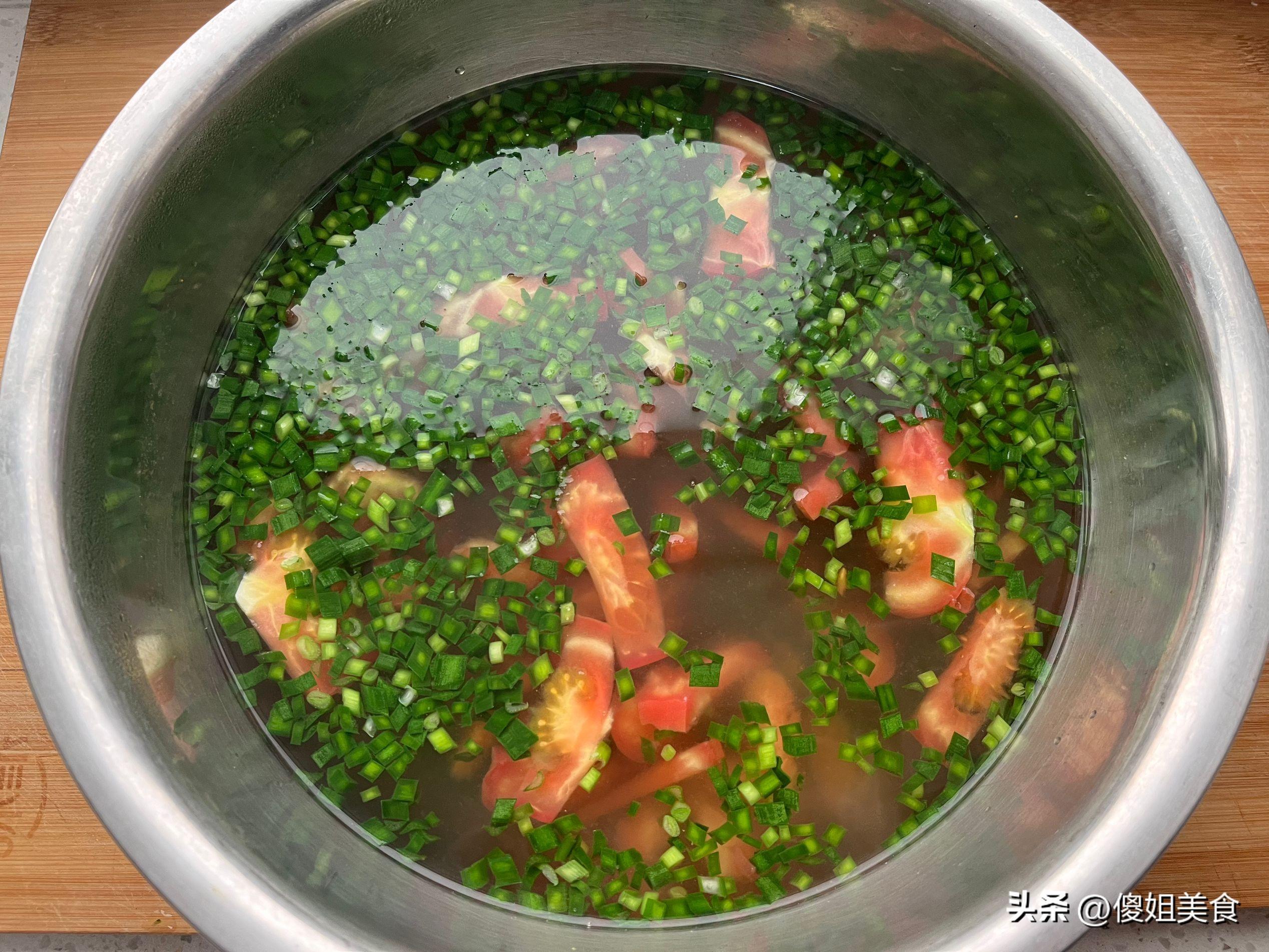 要想喝湯,涼麪得湯一定要提前煮開。首先準備一些純淨水用煮鍋大火煮,借用煮水的時間準備一些韭菜碎、西紅柿塊(蔬菜任意放就可以),把切好的配菜放入一個大點的容器內,然後把煮沸騰的開水倒在蔬菜上,把韭菜的香味滾燙出來,這樣讓它自然晾涼就可以。