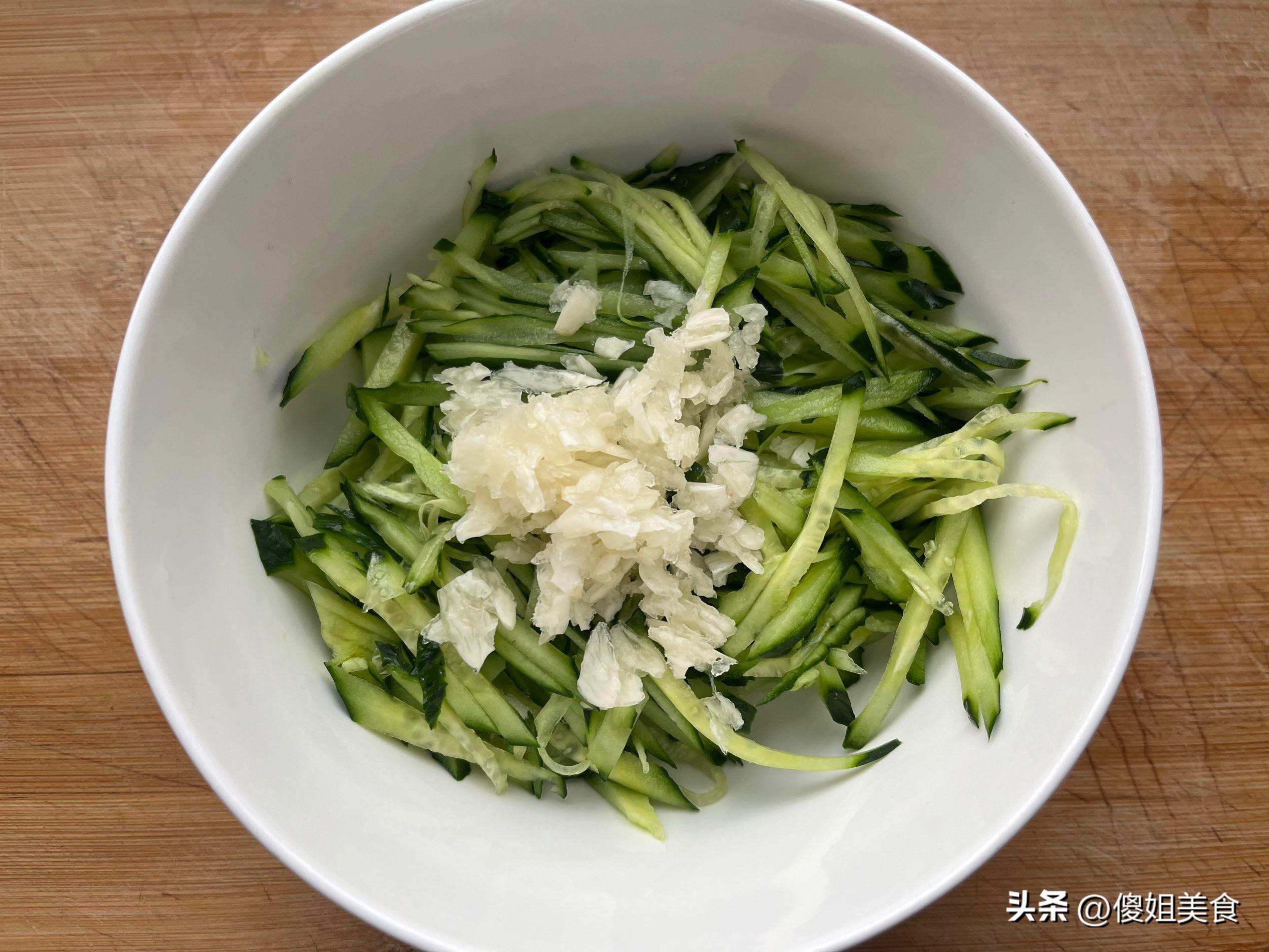 俗話說喫飯不喫蒜香味少一半,尤其是天熱喫點大蒜特別的下飯,準備一頭新鮮的大蒜剝去外皮,把大蒜敲成蒜泥。再準備一根黃瓜清洗乾淨後,先切成薄片再改刀切成細絲,把蒜泥和黃瓜絲放在一個碗內就可以。