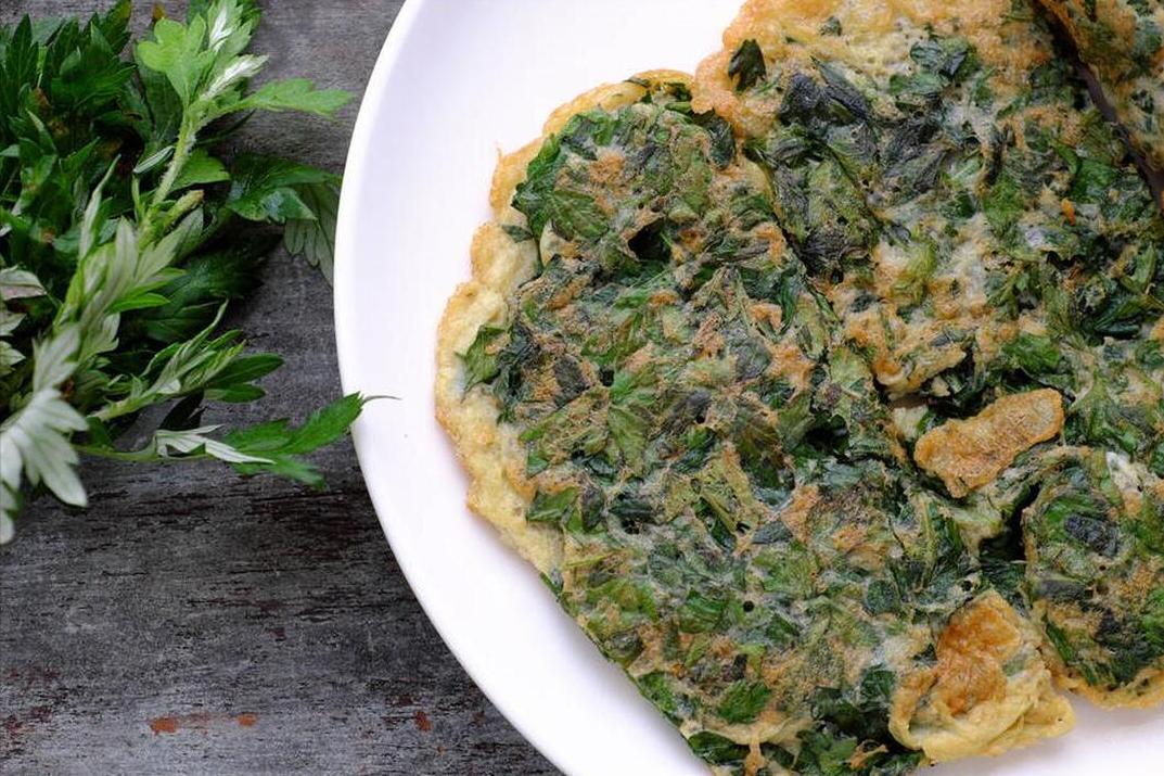 艾草用最嫩的葉子,洗淨之後瀝乾水分,然後燒一鍋開水,放上艾草來焯水,煮到變軟後撈出來切碎,盛在碗裏,把雞蛋也打進去,然後來點鹽、胡椒粉、雞精調味,充分攪拌均勻。鍋中倒油,燒熱後下入蛋液,煎到定型後翻面,直至兩個面都煎到金黃,出鍋開喫。