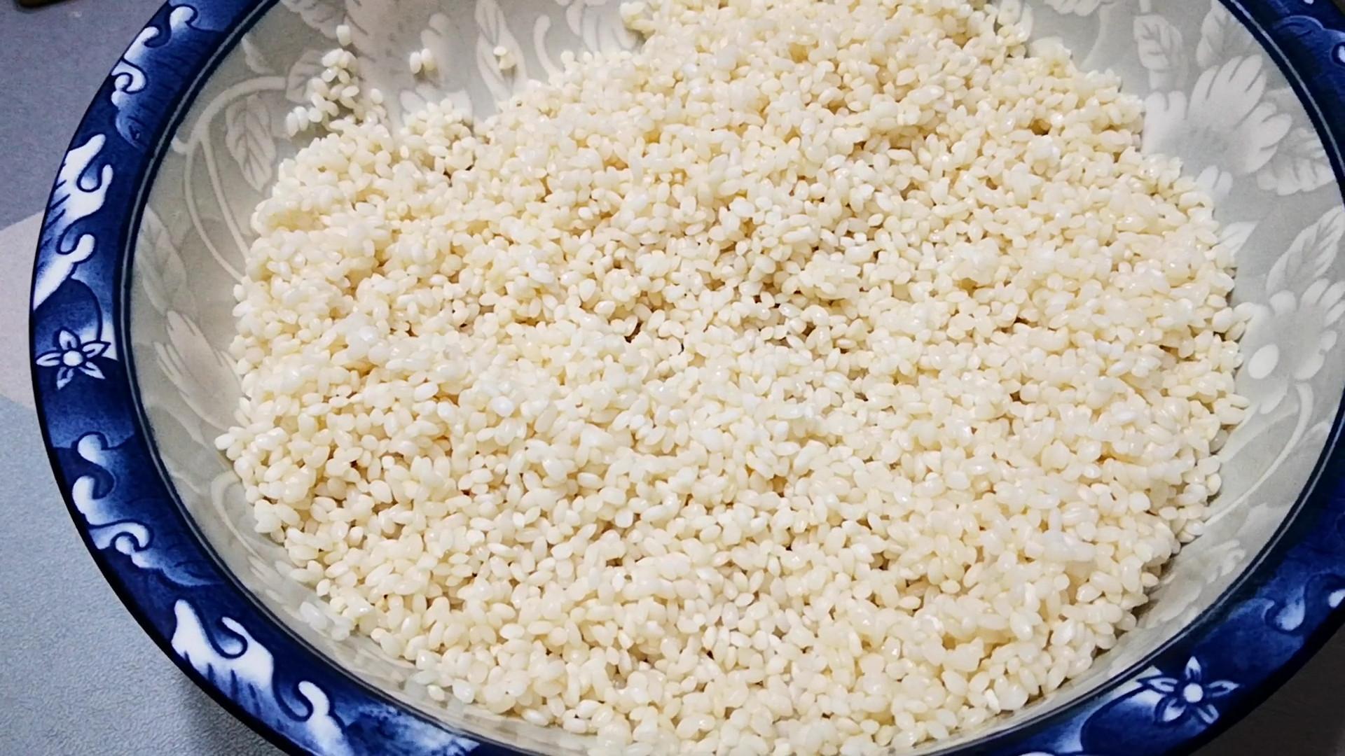 3、糯米清洗後也要浸泡,米和水按1:2的比例浸泡3~4個小時,倒入清水後要用手輕輕攪動一下,讓糯米充分吸收水分,防止糯米結團、浸泡不勻。花生米也提前加水浸泡3~4個小時左右。