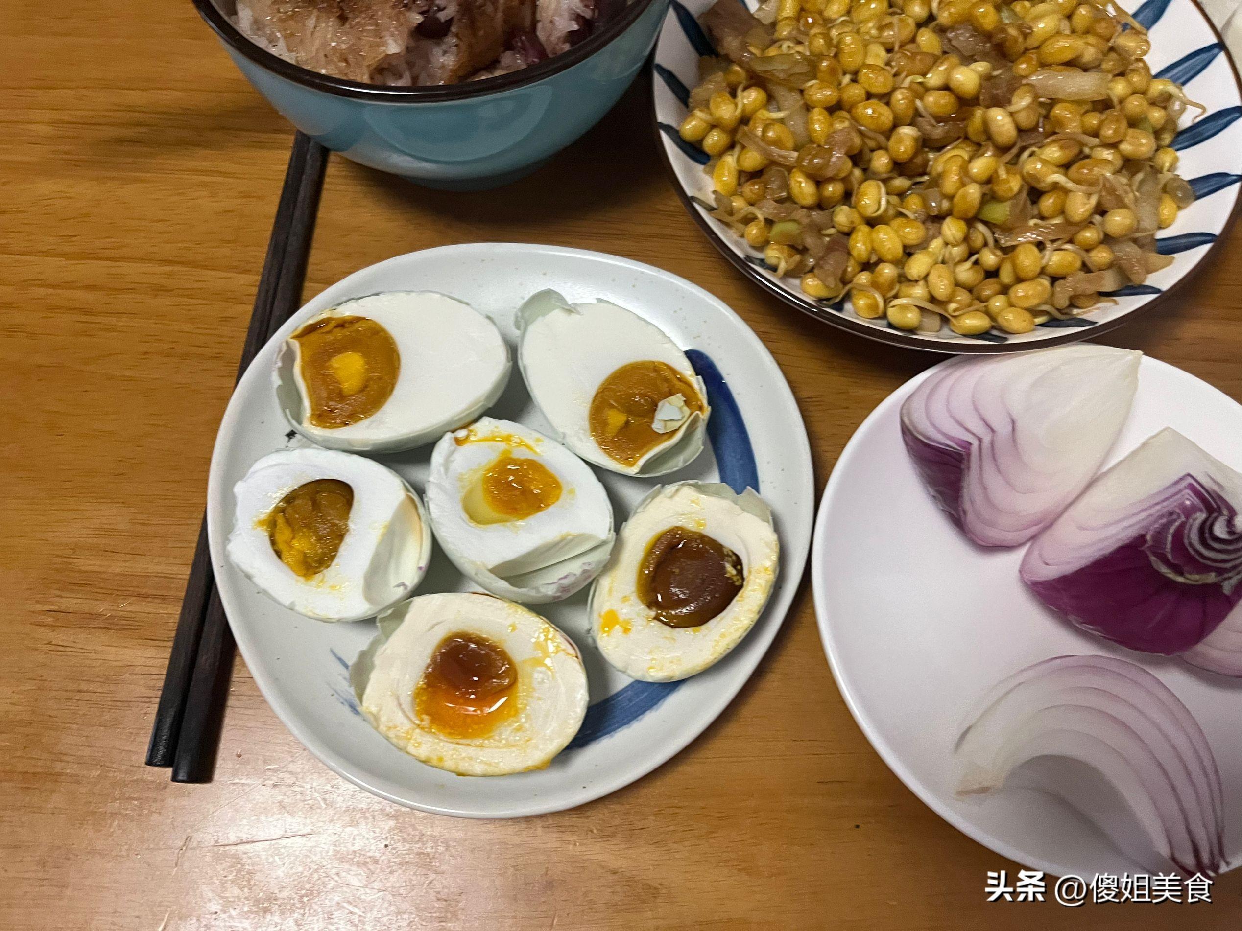 婆婆自己養的有幾隻鴨子,鴨蛋足夠我們幾口人喫的,每次都是留着給孩子喫,我和婆婆捨不得喫,孩子們漸漸也喫夠了。攢了好久的鴨蛋,婆婆就醃着喫了,醃的這個鴨蛋跟賣的一樣,流油鹹香正好喫。