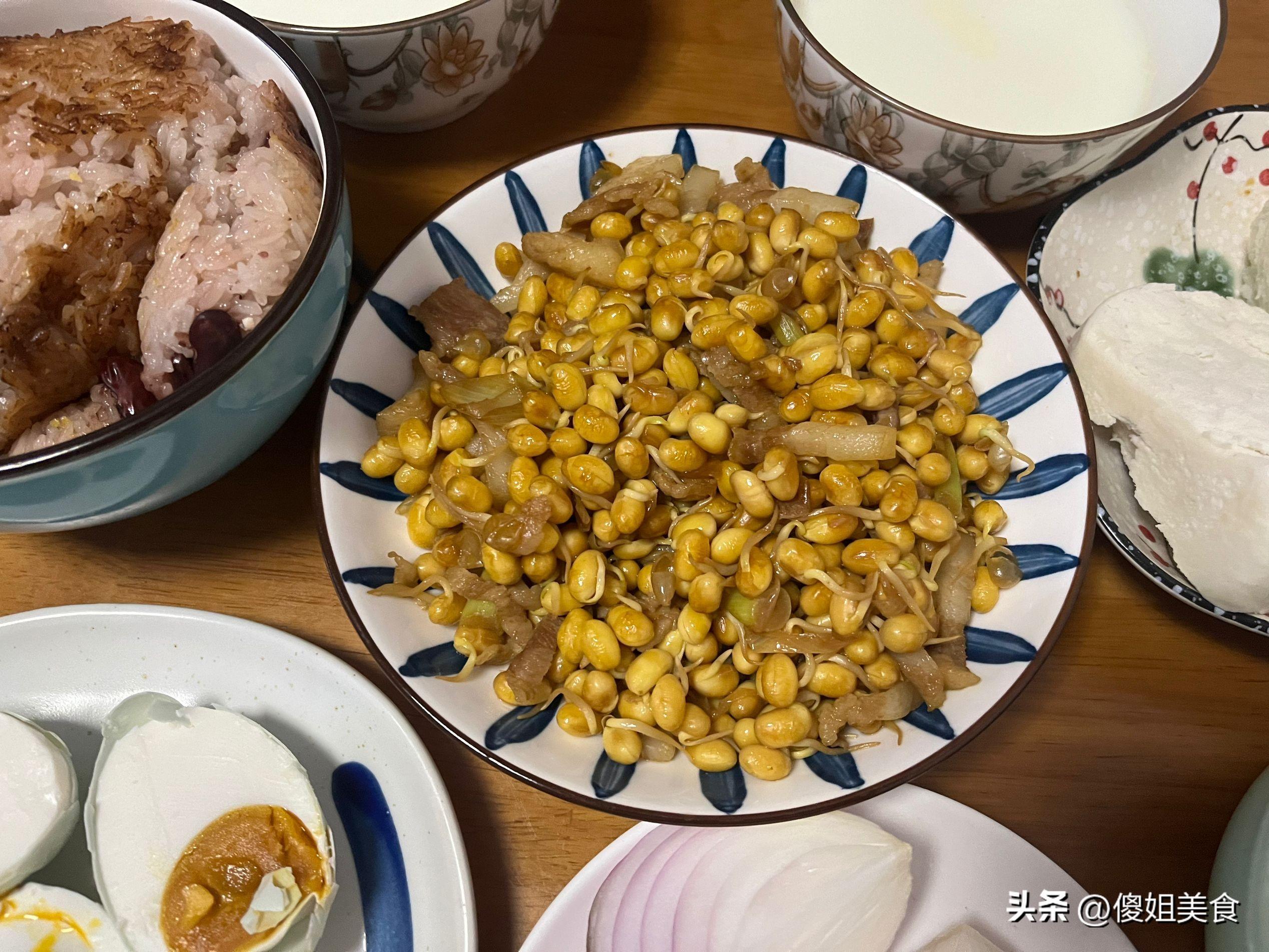 婆婆今年都70歲了,家裏裏裏外外都收拾的特別乾淨,做飯還好喫。黃豆芽可是我家常喫的菜,婆婆從來都不買,都是自己用黃豆生芽,乾淨還好喫。首先取一小把黃豆,把裏面癟壞的扔掉,然後將黃豆淘洗乾淨放在一個保溫的被子裏,往裏面倒入30度左右的熱水,密封好,這樣泡24小時,黃豆芽倒出來的時候就發芽了,芽很短正好喫。切點肉塊,簡單的炒一下,鮮香美味很好喫。