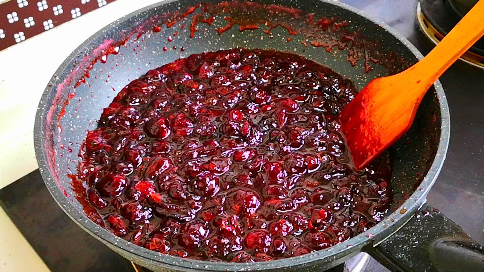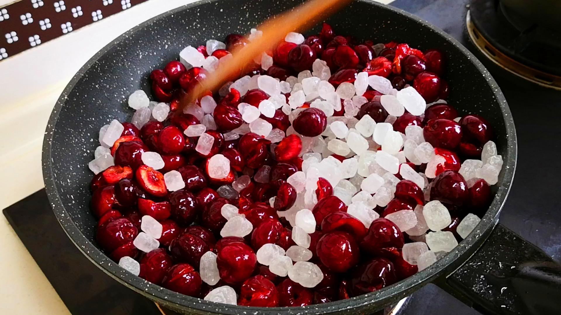 3、一切準備就緒,拿出不粘鍋倒入醃製的櫻桃,然後加入冰糖和水,注意水不要太多,和櫻桃持平即可,開小火慢慢熬製,熬製十分鐘左右,擠入半個檸檬汁,檸檬汁有很好的防腐保鮮的作用,加入檸檬汁不但能延長保質期,還能增加口感,然後繼續攪拌熬製,直到果醬變粘稠,推着有阻力即可關火,待完全晾涼後,再將其裝到無水無油的罐子裏,然後放到冰箱裏冷藏保存即可。