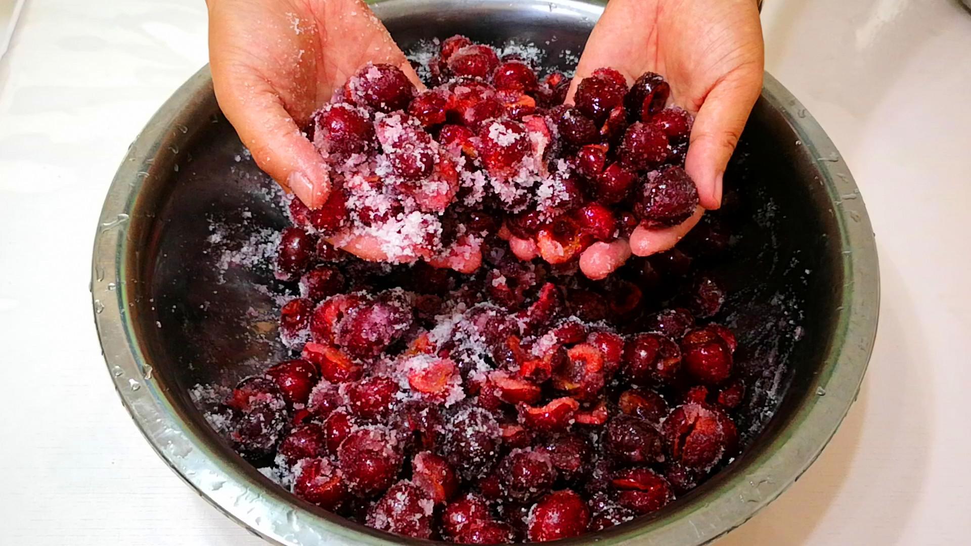 2、清洗後的大櫻桃晶瑩剔透,接下來要處理一下,去掉櫻桃把兒和中間的果核。處理好的櫻桃放入盆中,加入適量的白糖,10斤櫻桃加入8兩白糖,攪拌均勻後醃製20分鐘,目的是讓它出果膠。