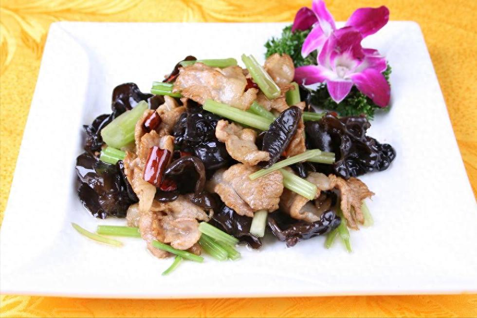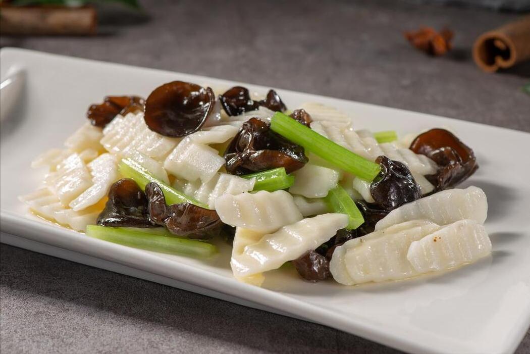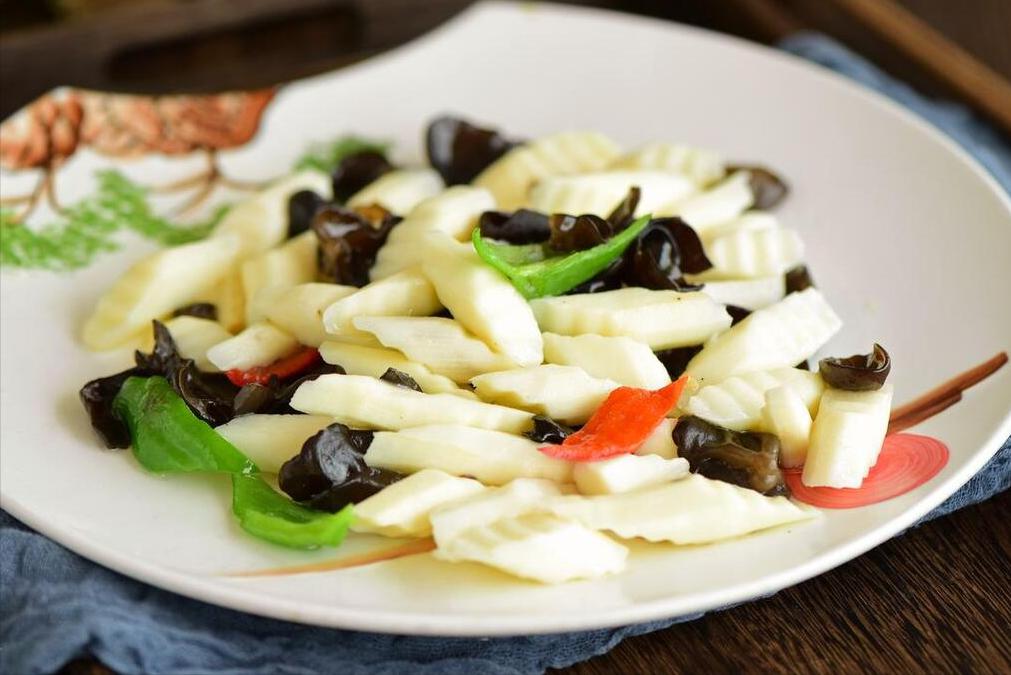 1、山藥清洗乾淨,削皮之後切成薄片,青辣椒也切成片狀,木耳是需要提前處理的,提前幾個小時就得泡好。