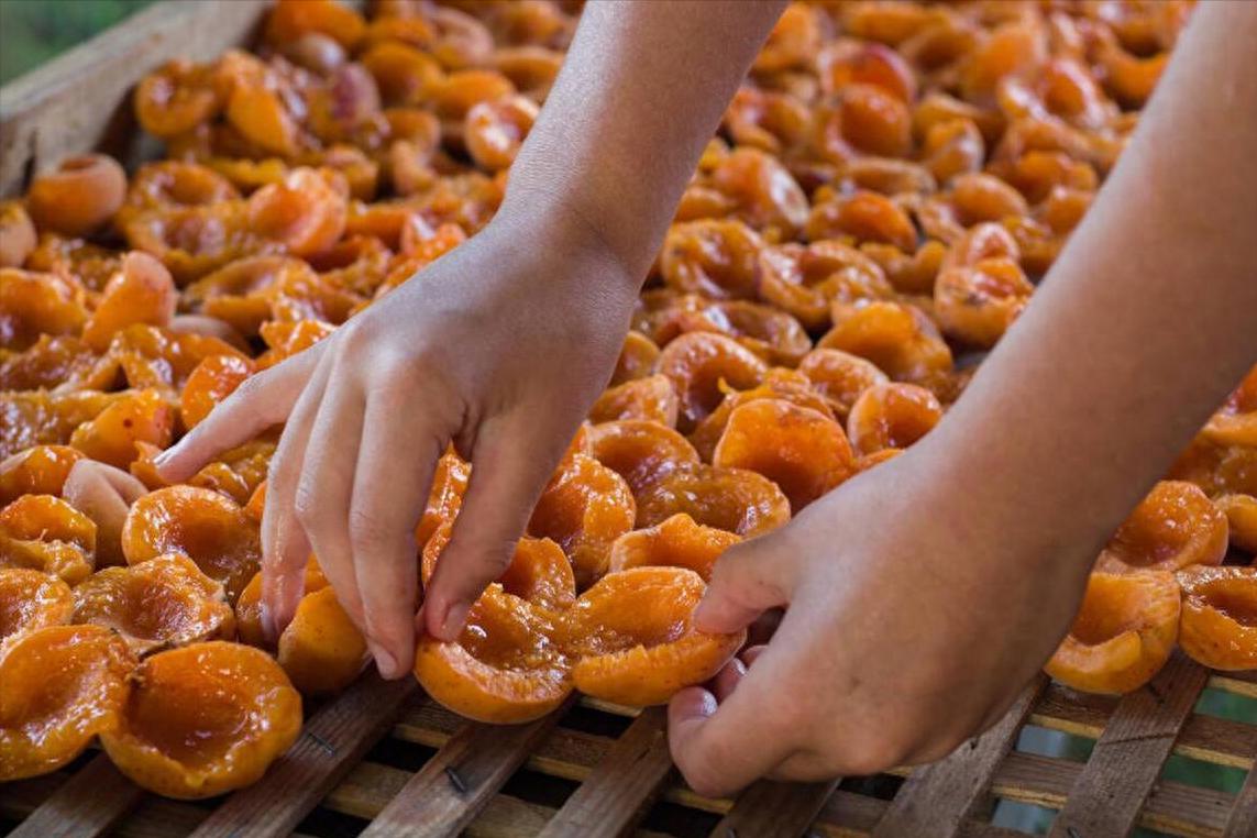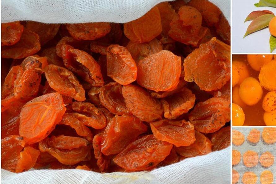 6、到時間後拿出來,放在烤盤中,均勻的鋪上去以後,放在太陽下開始暴曬即可。中途可以時不時的去翻一下面,直至曬到完全沒有水分,變成杏幹以後就可以保存起來慢慢喫啦,一般要曬3天以上的時間,老人孩子都可以喫,健康無添加,營養價值高。