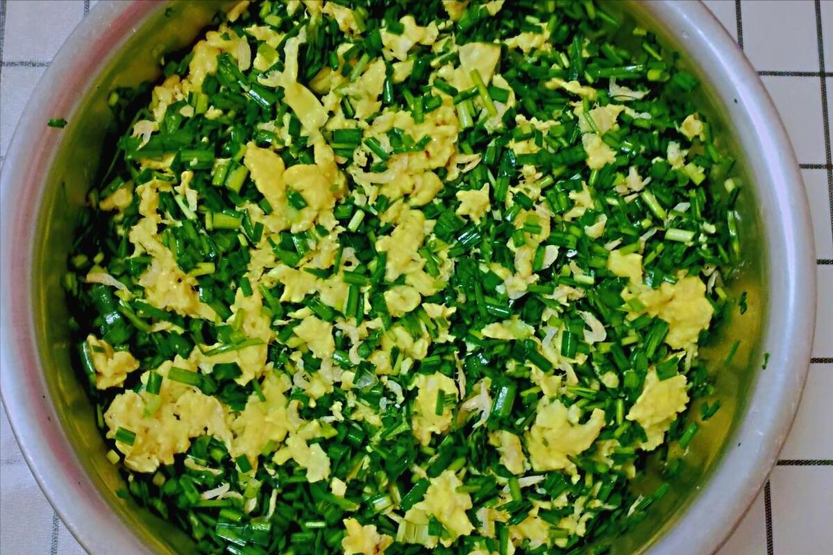 食材:韭菜、雞蛋、粉絲、蝦皮、鹽、雞精、五香粉、麪粉