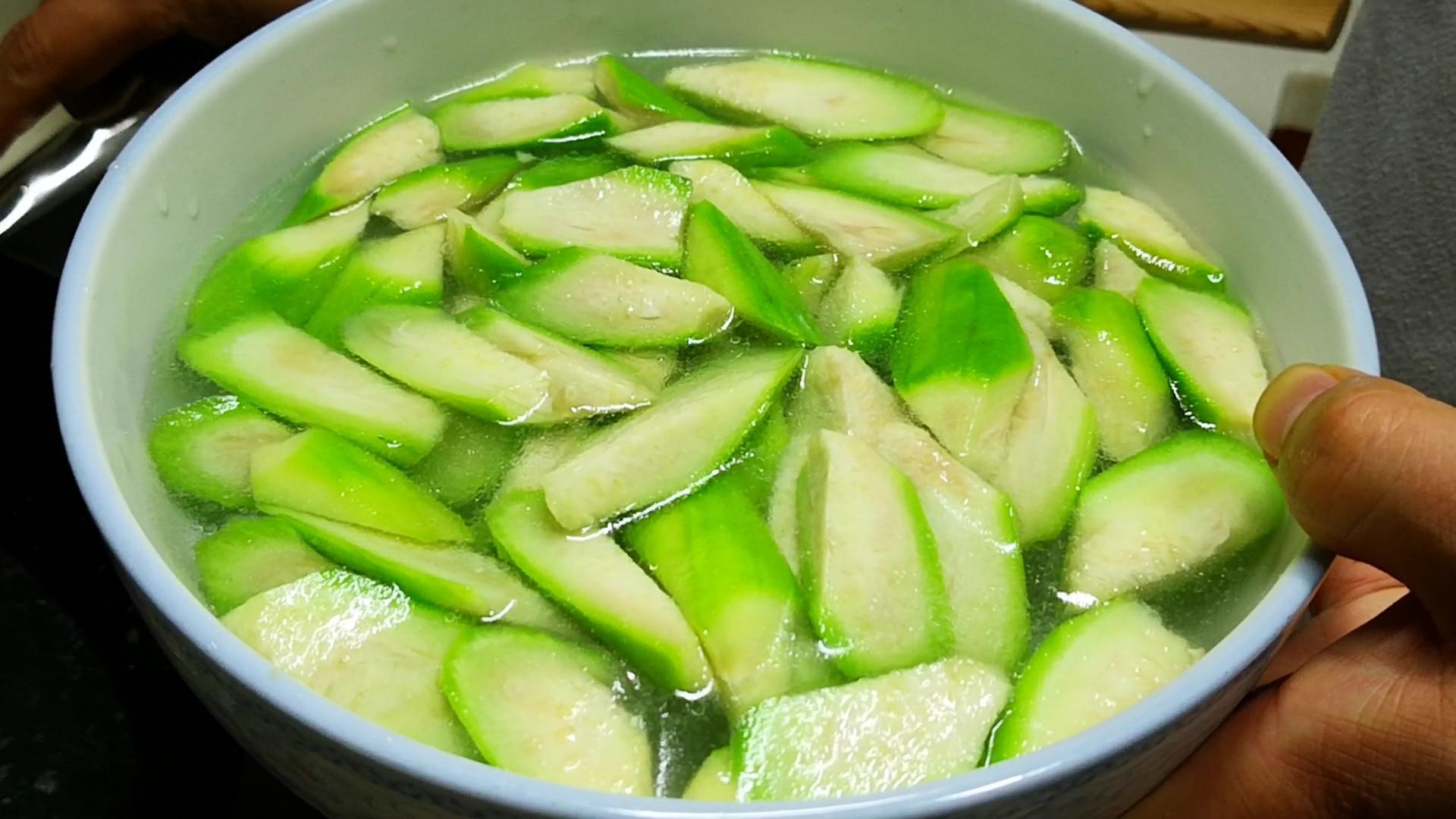 然後要立刻放到涼水中,不要長時間接觸空氣,否則絲瓜容易氧化變黑。接着再往水裏加入加入少許食鹽和白醋,攪拌至食鹽化開後浸泡5分鐘左右,這一步可以防止絲瓜氧化變黑,還可以去除絲瓜的青澀異味。