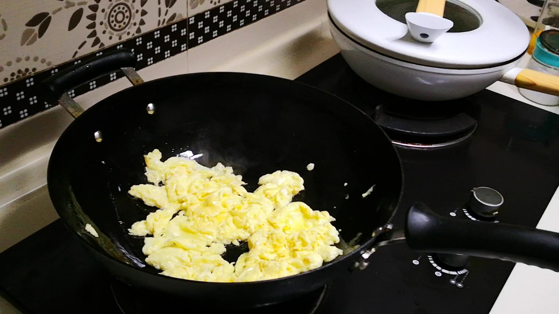 再取一個小碗,打入3個雞蛋,滴入幾滴料酒,少加一點點鹽,順着一個方向打散。再起鍋加油,倒入打散的蛋液,用鏟子翻炒成大小均勻的雞蛋塊後關火,盛出備用。