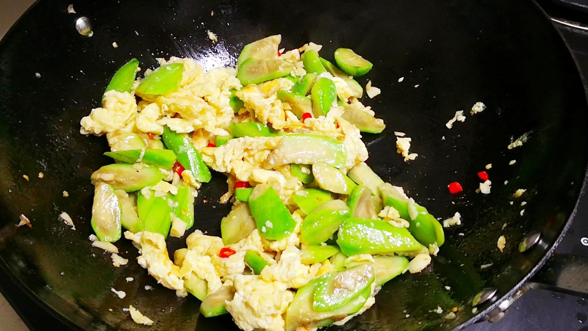 6.接着另起鍋加油,油溫5成熱時先放入蒜末、薑末和小米辣圈,翻炒片刻炒出香味後再放入絲瓜塊,大火翻炒至絲瓜斷生後再倒入雞蛋塊,然後將調好的料汁倒入,繼續大火快炒至料汁被絲瓜吸收後,即可關火出鍋,又鮮又嫩的絲瓜炒雞蛋就做好了。