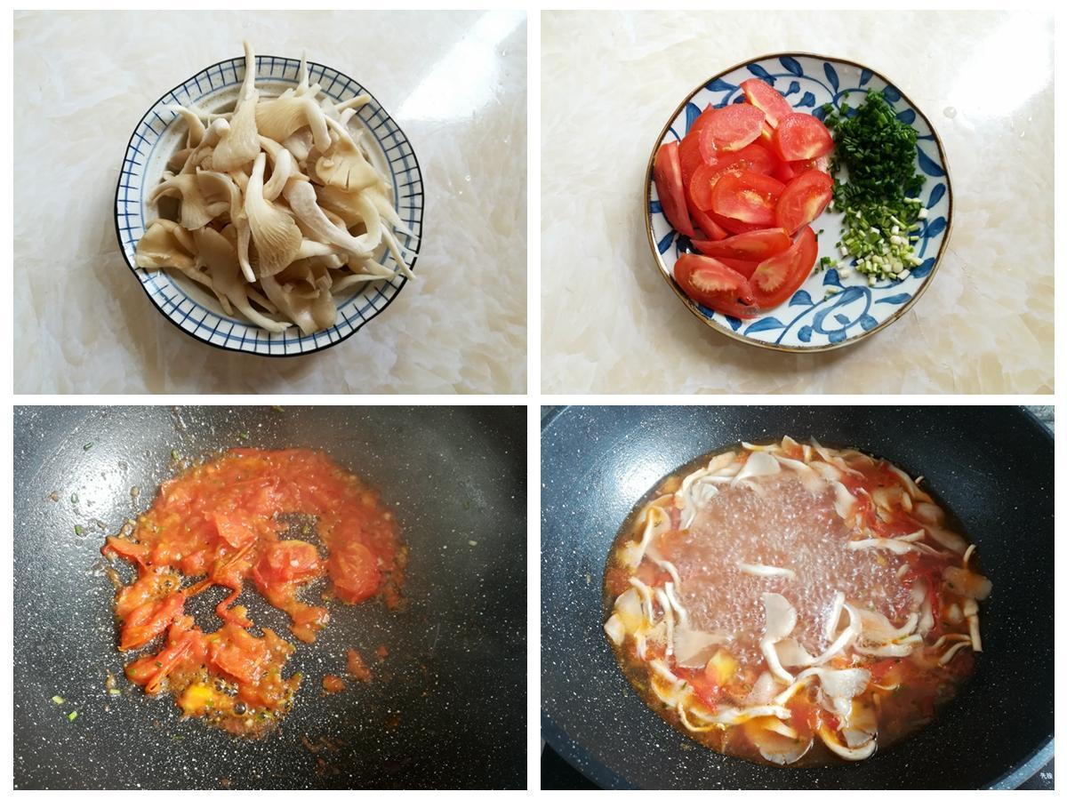 做法:1,秀珍菇清洗乾淨,撕成合適的大小,番茄切成薄片,香蔥只要葉子部分,切成顆粒。