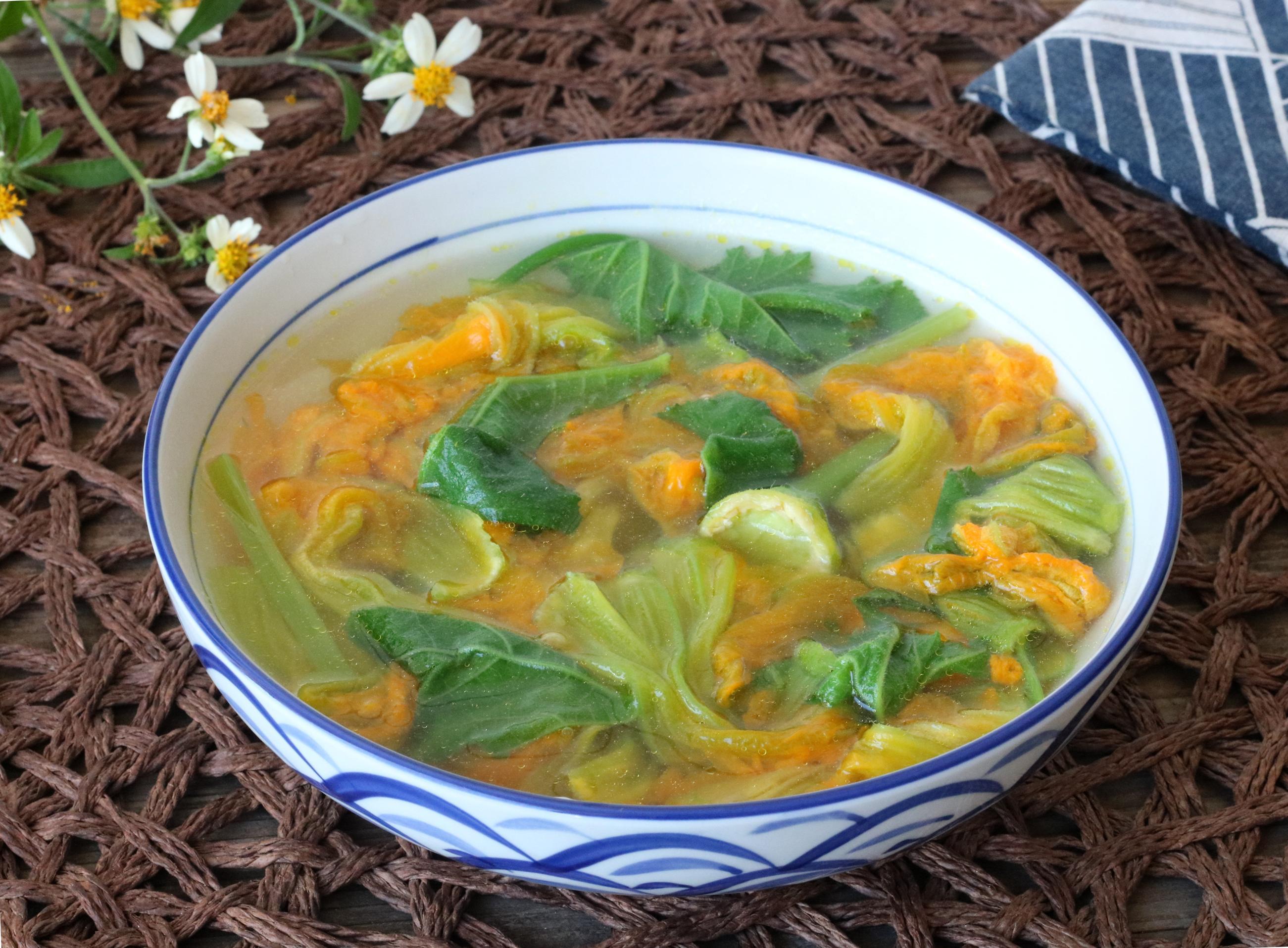3、南瓜花湯,在廣西非常受歡迎的一道蔬菜湯,但很多外省人都沒喫過。金黃色的南瓜花,看着就很有食慾,花朵自帶甘甜,煮湯特別的鮮美。