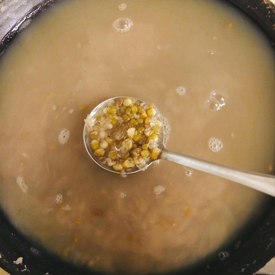 5、看到這樣的狀態後,可以往裏面加上點蓮子、百合什麼的,再繼續煮上半個小時的樣子,多煮一會兒綠豆出沙率會更高,半個小時之後,就可以關火啦,想喝甜的再放點冰糖,稍微攪拌一下,關火後靜置幾個小時,等晾涼以後就可以盛出來開喝了。