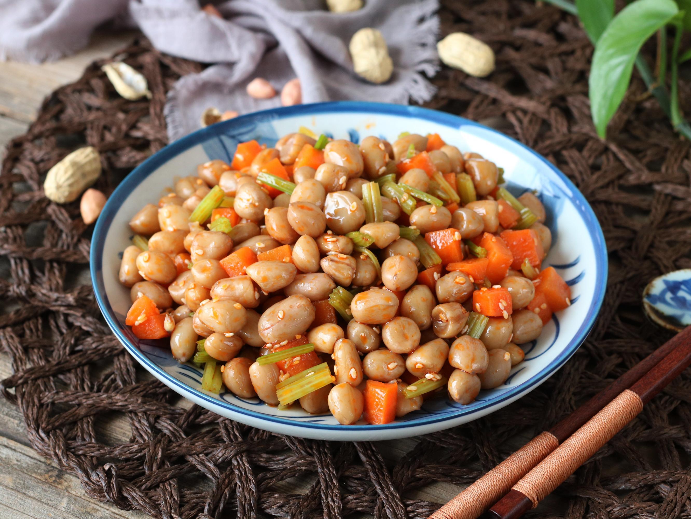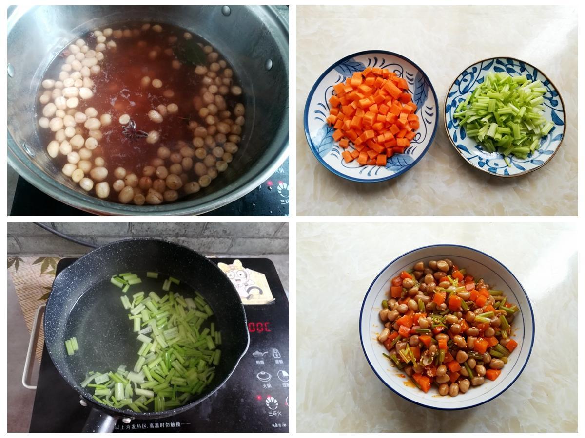 食材:花生米、胡蘿蔔、芹菜、八角、香葉、辣椒油、低鹽生抽