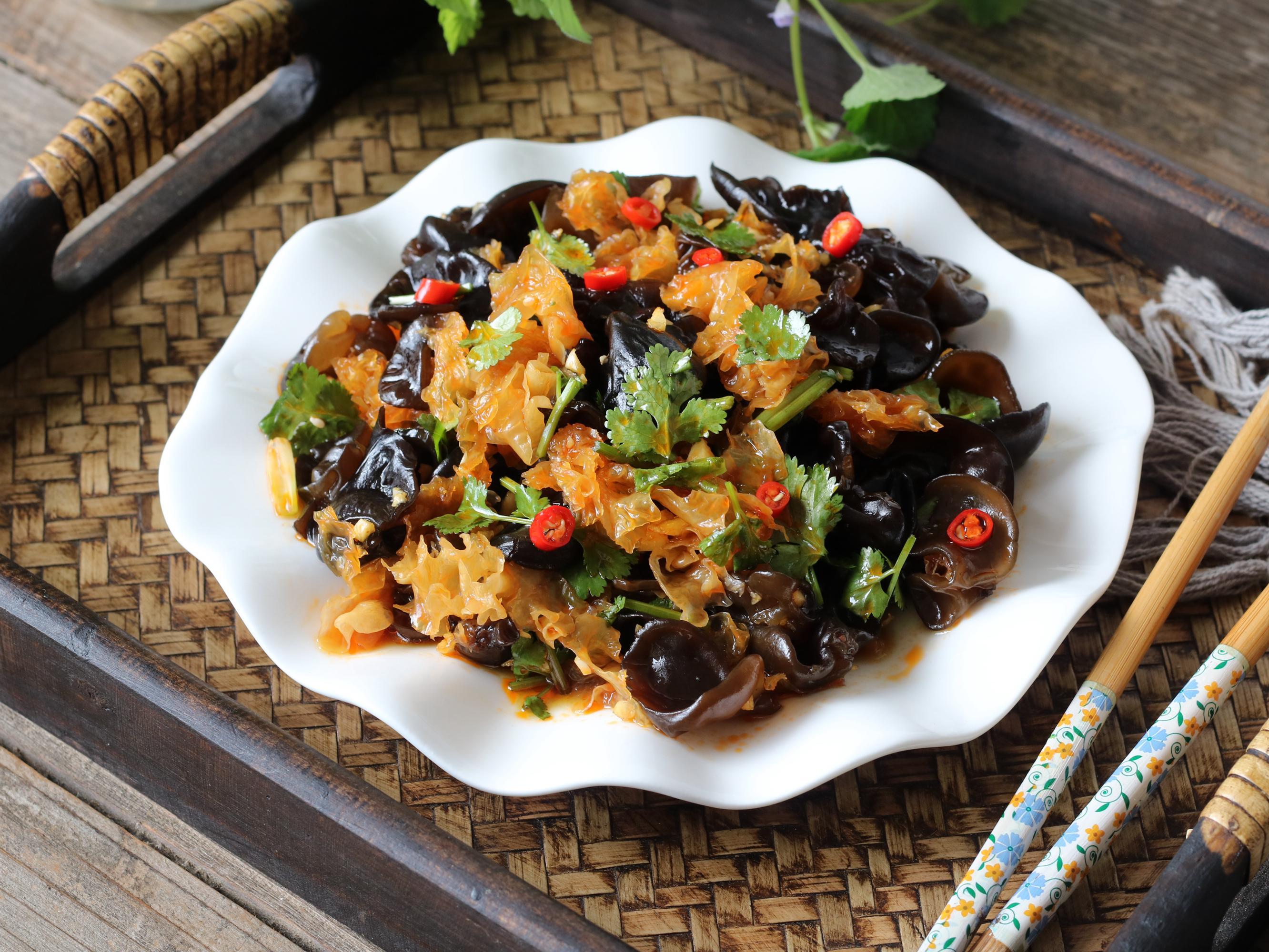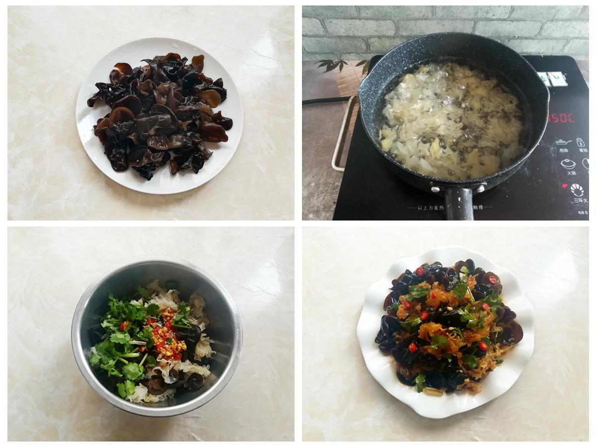 食材:銀耳、黑木耳、紅辣椒、香菜、大蒜、生抽、辣椒油