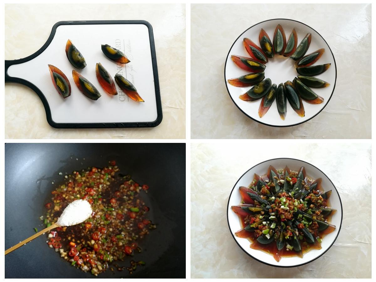 做法:1,皮蛋剝殼清洗乾淨,切成6瓣放到盤子裏,擺成圓環形。青椒切顆粒,紅辣椒切圓圈,大蒜也切顆粒。