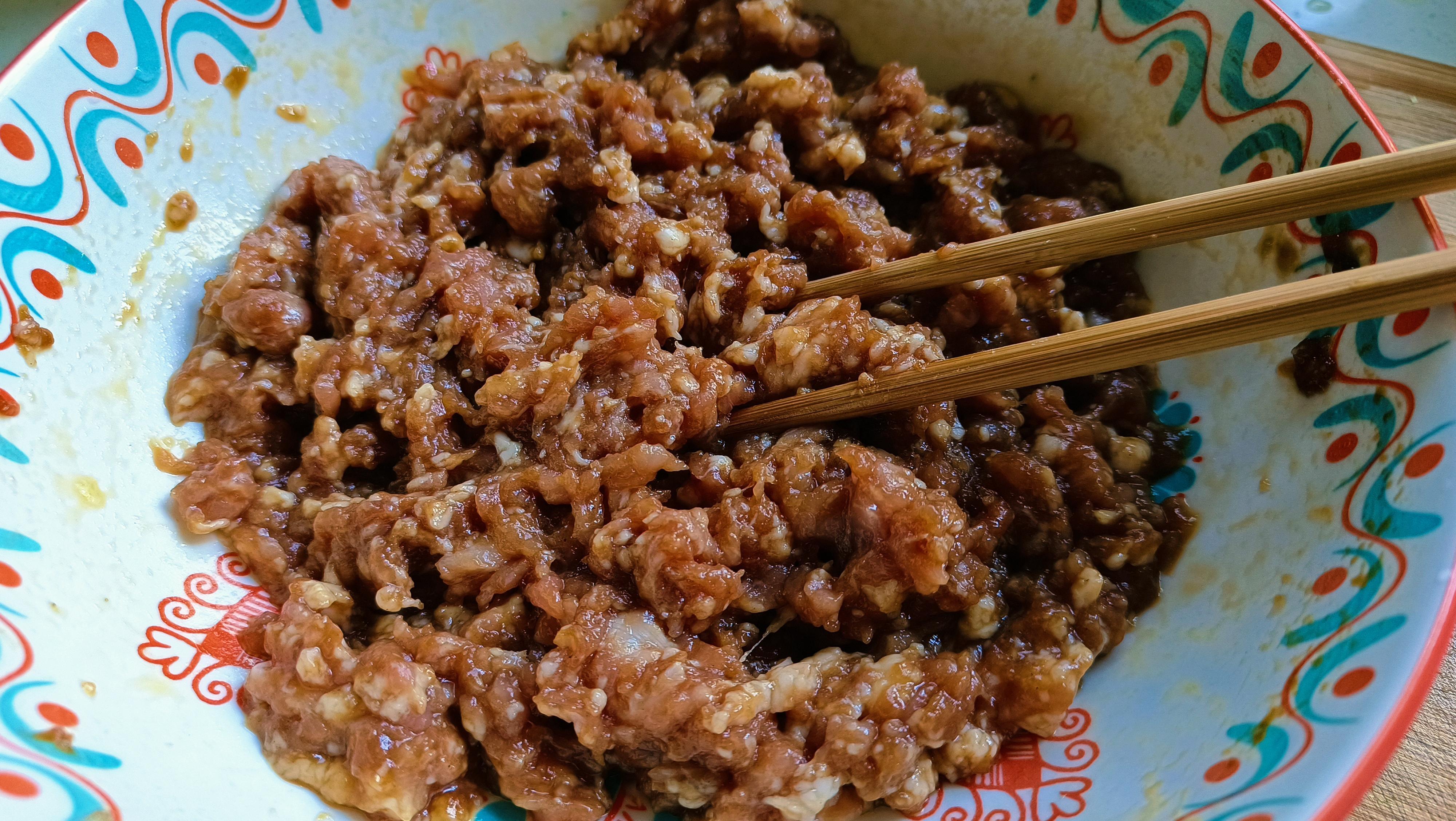 3、由於水蘿蔔纓子比較喜油,所以最好選用肥瘦相間的五花肉,放到絞餡機中絞碎,然後倒入盆中,然後加入適量的胡椒粉去腥,加入適量的生抽,加入幾滴老抽上色,加入適量的蠔油,用手抓勻,叫它充分的吸收料汁,再打入一個雞蛋,繼續朝一個方向攪拌均勻後醃製10分鐘。這樣做不但上了味道,而且喫起來會滑嫩爽口。