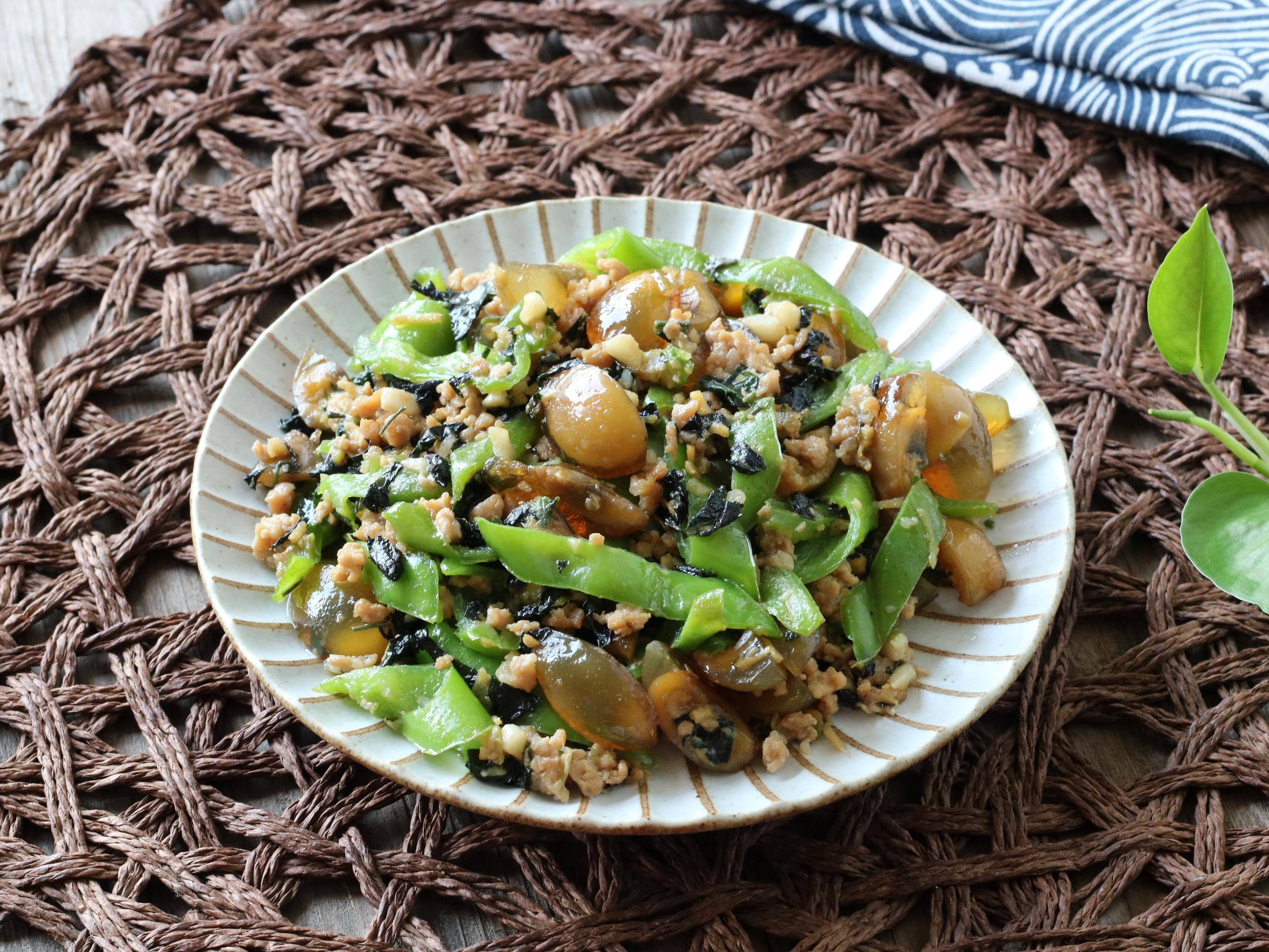 3,加入青椒翻炒斷生,加入炒熟的肉末和變蛋翻炒均勻,加適量的鹽調味。
