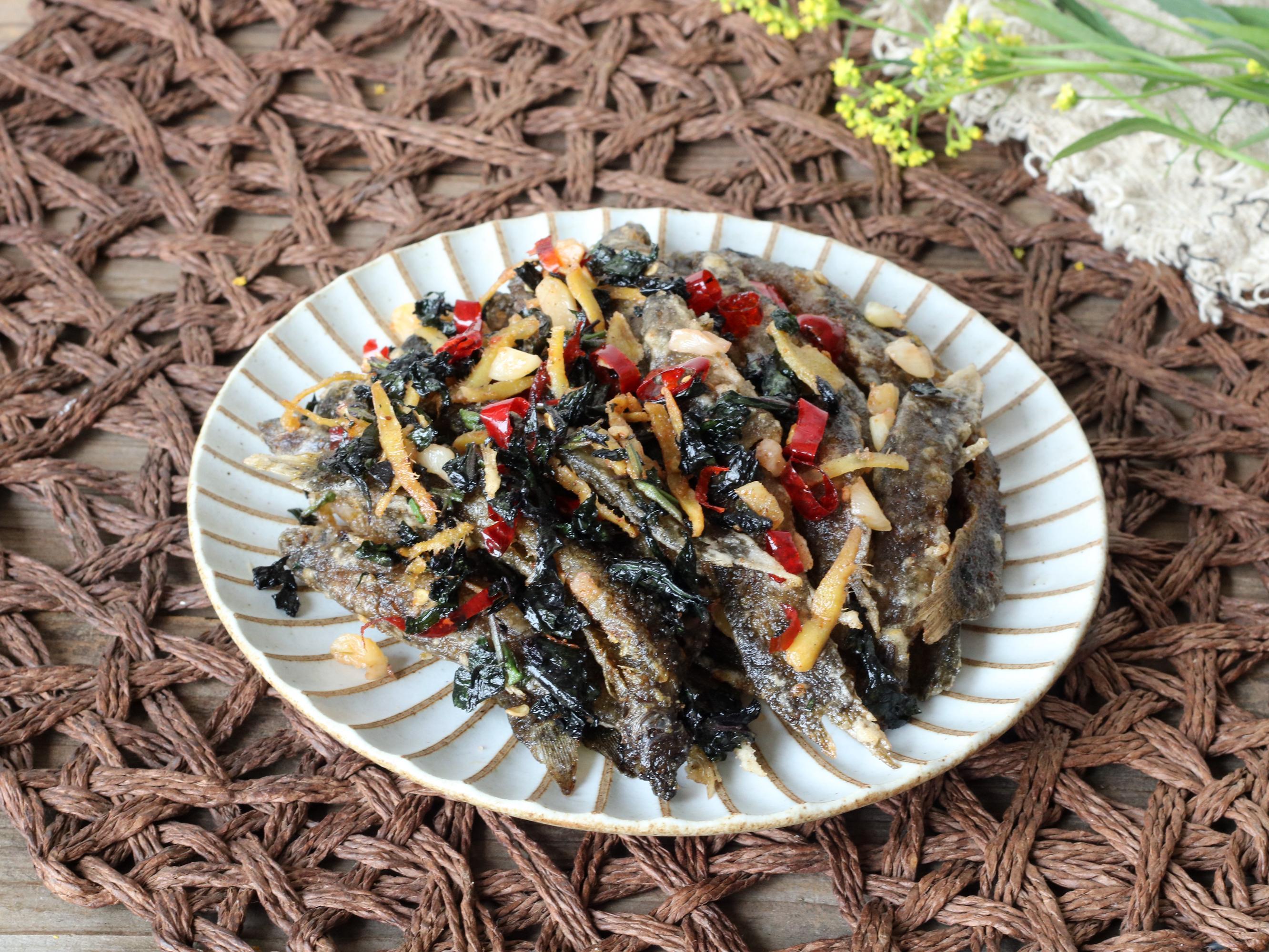 6,加入炸過的泥鰍,跟紫蘇一起翻炒均勻,加適量的鹽調味。