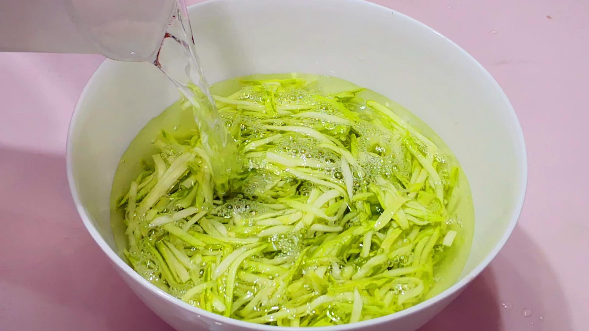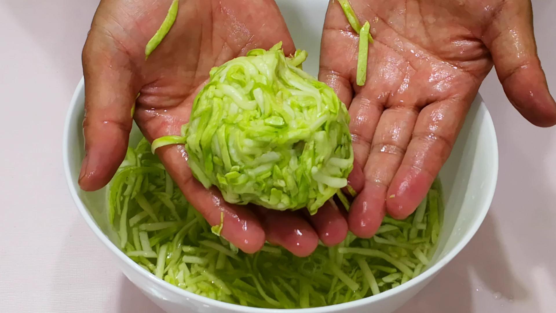 2.十幾分鍾後我們可以看到西葫蘆已經剎出了很多的水分,這時我們用清水把它多衝洗幾遍,衝去多餘的鹽水,以免包好餃子後太鹹。然後擠幹水分後將其剁細,放入碗中備用。