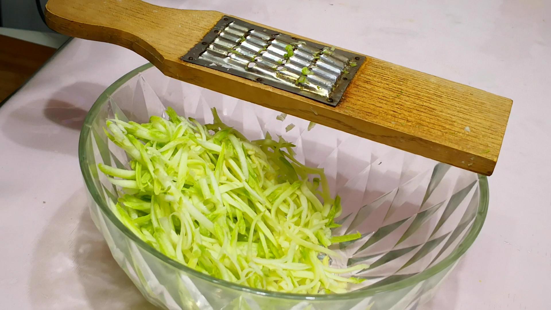 1.先把西葫蘆清洗乾淨,然後豎着從中間切開,去掉中間的瓜瓤,用擦菜板擦成細絲。擦成絲後的西葫蘆放入大碗中,然後加入一匙食鹽,下手抓拌一會兒,讓鹽充分化開後,再放一邊醃製十分鐘以上,剎出西葫蘆中的水分,這樣再包餃子的時候就不會出水了。