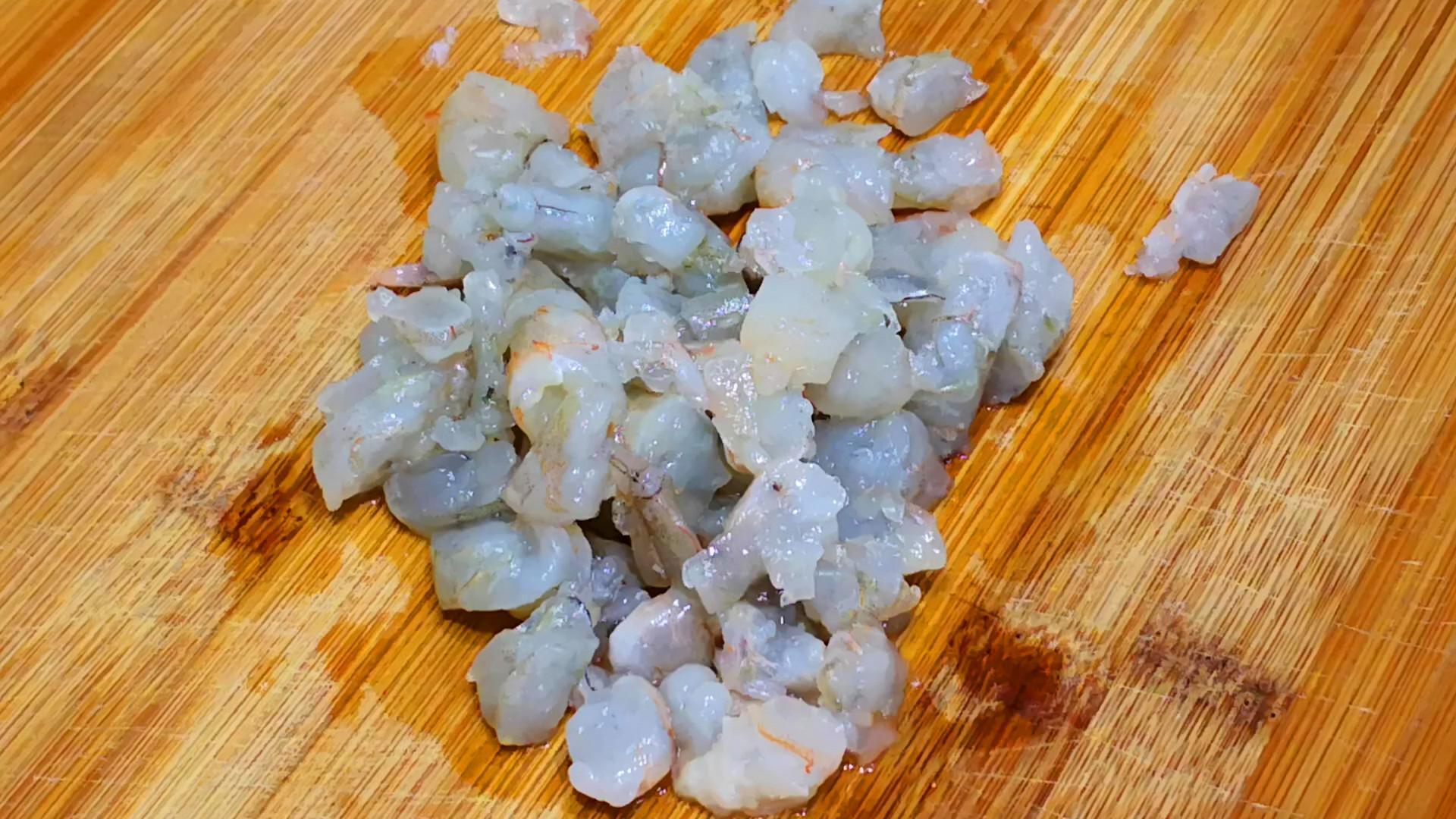 剝好的蝦仁洗淨後切成小丁放入碗中,然後加入適量的料酒醃製備用。
