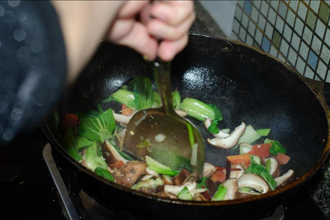 5、炒青菜一定要開大火,用最大火來爆炒,炒的時間更短,青菜不出水,顏色也鮮亮,這是第2個重點。大火翻炒片刻以後,來點鹽和松鮮鮮調味,用雞精、味精替代也可以,接着根據個人口味,再倒上一點點蠔油提鮮,用鏟子快速翻炒兩下,炒勻之後就可以出鍋啦。