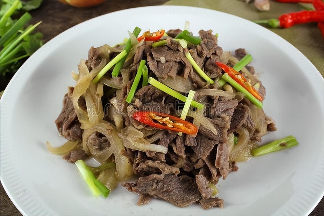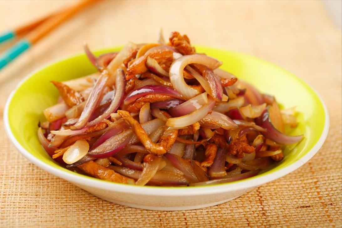 3、接下來放入洋蔥翻炒,炒到斷生、變軟之後,再加入肥牛翻炒片刻,接着倒入剛纔調製好的料汁,繼續翻炒一會兒,直至徹底炒熟以後,往上面撒上少許蔥花點綴,就可以出鍋開喫啦,下飯一絕。