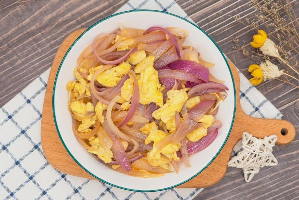 2、然後往鍋內倒油,先把雞蛋炒出來,倒進去之後開始翻炒,炒成嫩嫩的那種狀態後,就可以盛出來了,不需要炒成十分熟。之後再添點油,燒熱以後下入洋蔥,開始慢慢翻炒,直至將其炒軟以後,倒入炒好的雞蛋,順便來點鹽和雞精,翻炒兩下即可出鍋。