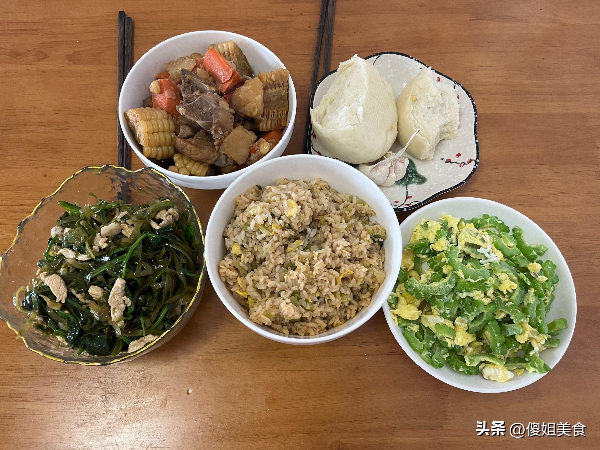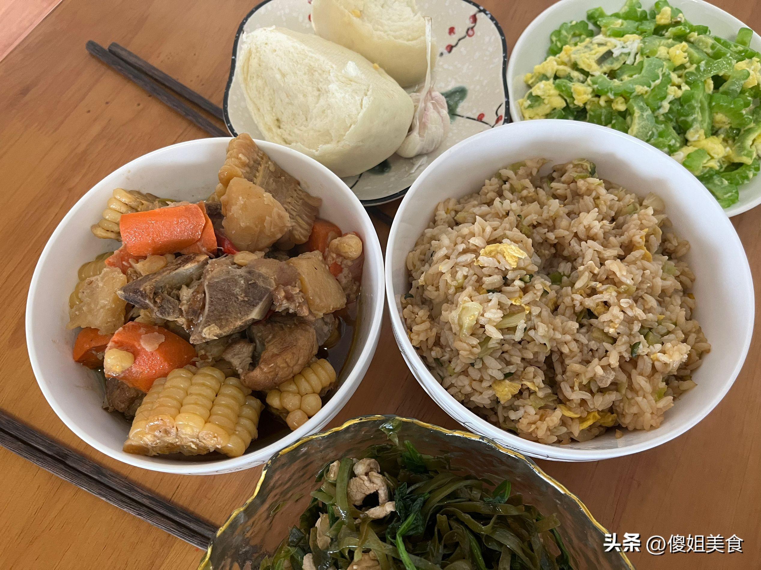 排骨燉玉米是昨天中午剩下的,我看兒子很愛喫,中午就加熱了一下。而這個蛋炒飯也是昨天喫排骨拌飯剩的,剩米飯有點幹了,我就拿雞蛋和黃瓜炒了一下,還挺好喫,兒子自己喫了這一大碗。
